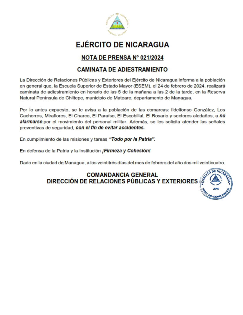 La Dirección de Relaciones Públicas y Exteriores del Ejército de Nicaragua informa a la población en general que, la Escuela Superior de Estado Mayor (ESEM), el 24 de febrero de 2024, realizará caminata de adiestramiento en horario de las 5 de la mañana a las 2 de la tarde, en la Reserva Natural Península de Chiltepe, municipio de Mateare, departamento de Managua.