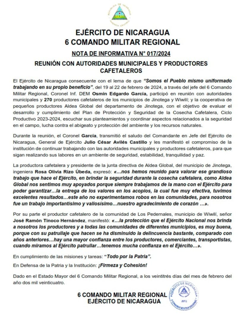 El Ejército de Nicaragua consecuente con el lema de que “Somos el Pueblo mismo uniformado trabajando en su propio beneficio”, del 19 al 22 de febrero de 2024, a través del jefe del 6 Comando Militar Regional, Coronel Inf. DEM Osmín Edgardo García, participó en reunión con autoridades municipales y 270 productores cafetaleros de los municipios de Jinotega y Wiwilí; y la cooperativa de pequeños productores Aldea Global del departamento de Jinotega, con el objetivo de evaluar el desarrollo y cumplimiento del Plan de Protección y Seguridad de la Cosecha Cafetalera, Ciclo Productivo 2023-2024, escuchar sus planteamientos y coordinar aspectos relacionados a la seguridad en el campo, lucha contra el abigeato y protección del ambiente y los recursos naturales.