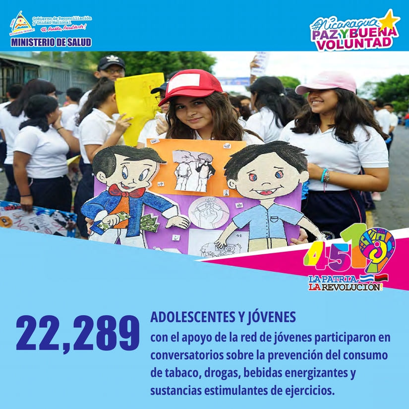 • 22,289 adolescentes y jóvenes con el apoyo de la Red de Jóvenes participaron en conversatorios sobre la prevención del consumo de tabaco, drogas, bebidas energizantes y sustancias estimulantes de ejercicios.
