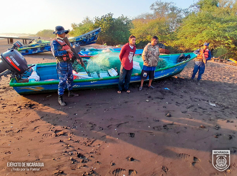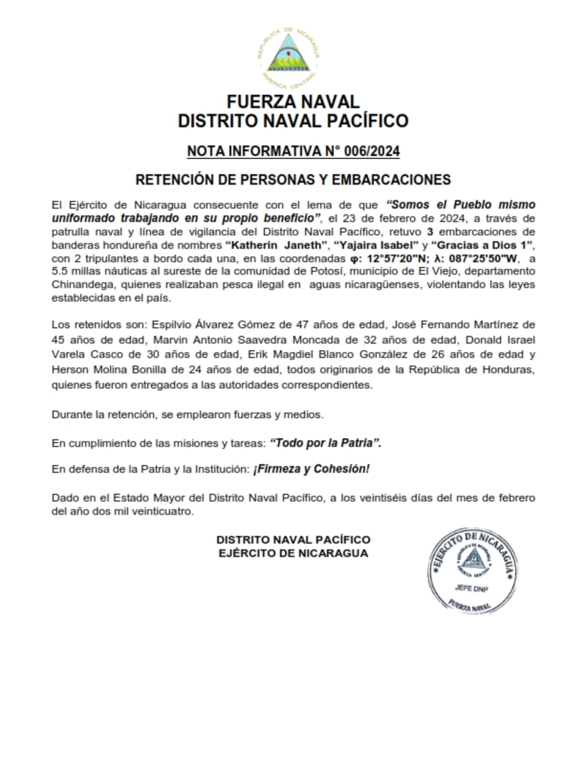 El Ejército de Nicaragua consecuente con el lema de que “Somos el Pueblo mismo uniformado trabajando en su propio beneficio”, el 23 de febrero de 2024, a través de patrulla naval y línea de vigilancia del Distrito Naval Pacífico, retuvo 3 embarcaciones de banderas hondureña de nombres “Katherin Janeth”, “Yajaira Isabel” y “Gracias a Dios 1”, con 2 tripulantes a bordo cada una, en las coordenadas φ: 12°57'20"N; λ: 087°25'50"W, a 5.5 millas náuticas al sureste de la comunidad de Potosí, municipio de El Viejo, departamento Chinandega, quienes realizaban pesca ilegal en aguas nicaragüenses, violentando las leyes establecidas en el país.
