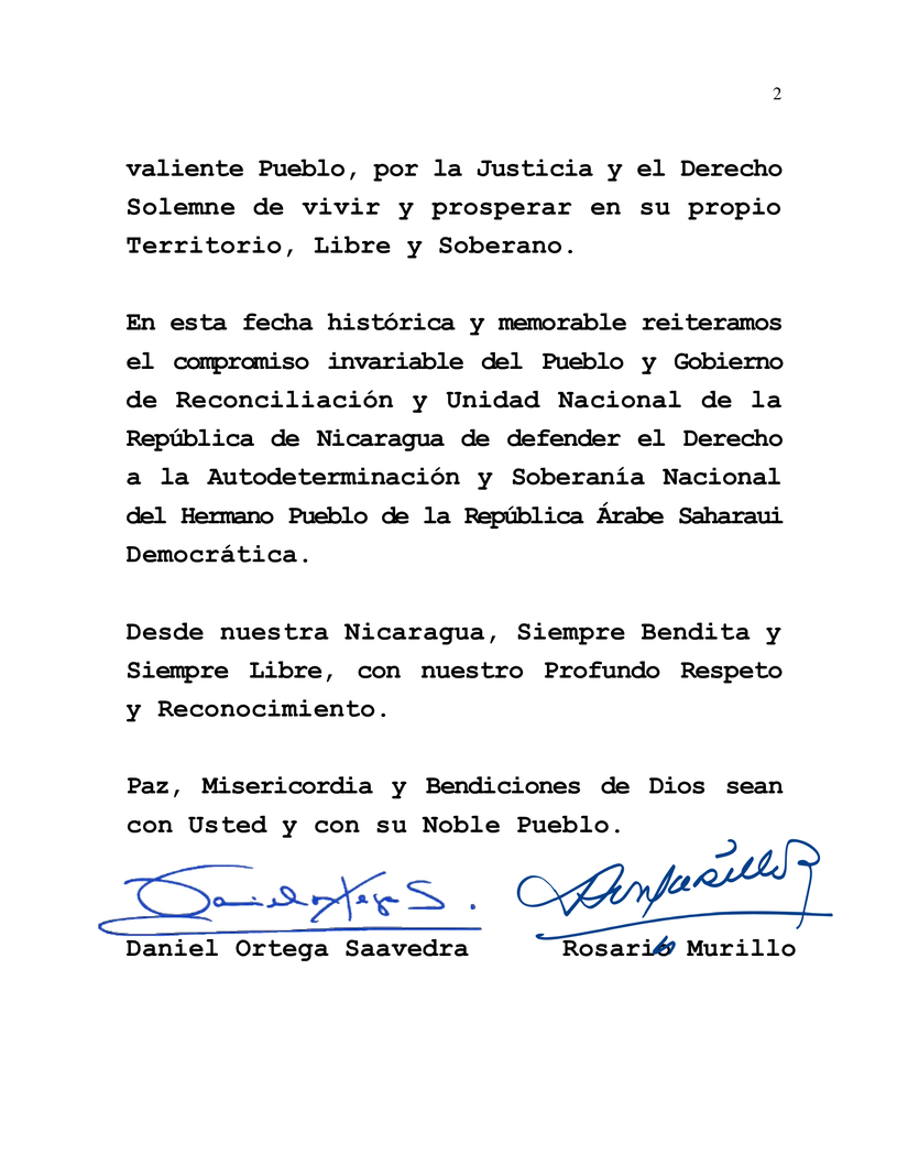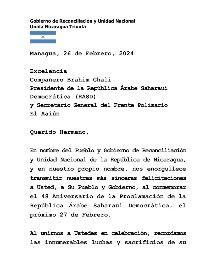En nombre del Pueblo y Gobierno de Reconciliación y Unidad Nacional de la República de Nicaragua, y en nuestro propio nombre, nos enorgullece transmitir nuestras más sinceras felicitaciones a Usted, a Su Pueblo y Gobierno, al conmemorar el 48 Aniversario de la Proclamación de la República Árabe Saharaui Democrática, el próximo 27 de Febrero.