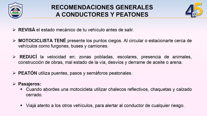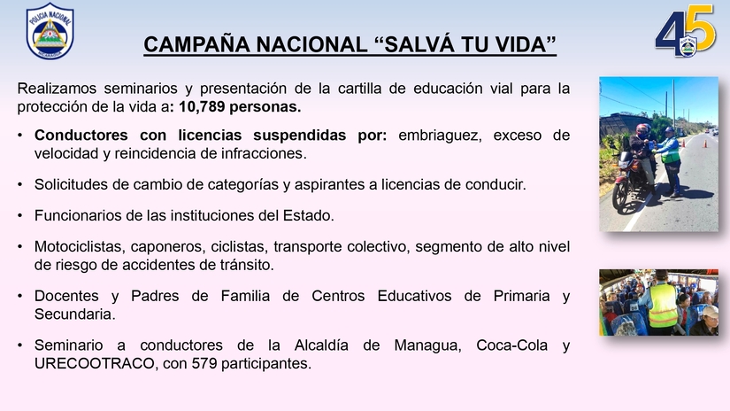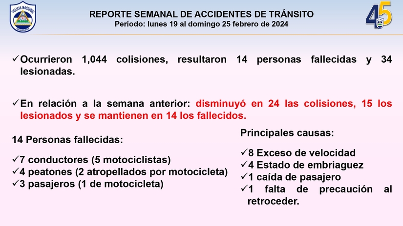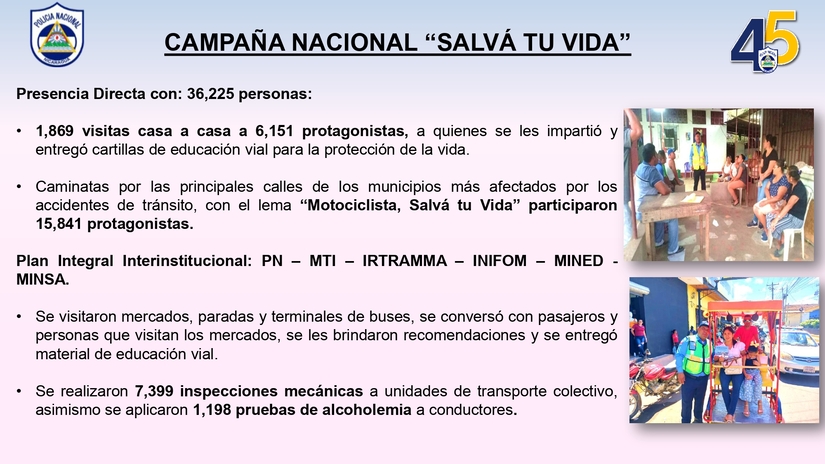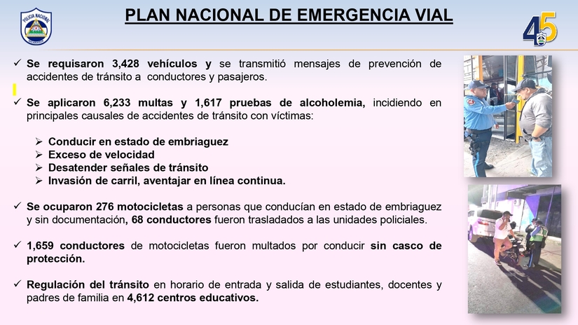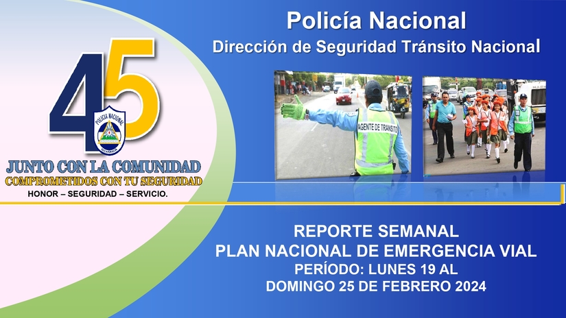 La Policía Nacional dio a conocer el informe de resultados del Plan Nacional de Emergencia Vial comprendido del 19 de febrero al 25 de febrero, en el que se refleja la realización de seminarios y presentación de cartilla de Educación Vial a más de 10 mil protagonistas.