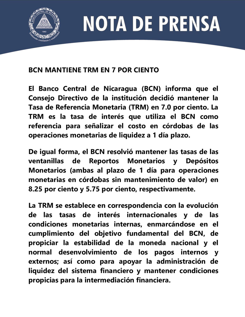 El Banco Central de Nicaragua (BCN) informa que el Consejo Directivo de la institución decidió mantener la Tasa de Referencia Monetaria (TRM) en 7.0 por ciento. La TRM es la tasa de interés que utiliza el BCN como referencia para señalizar el costo en córdobas de las operaciones monetarias de liquidez a 1 día plazo.