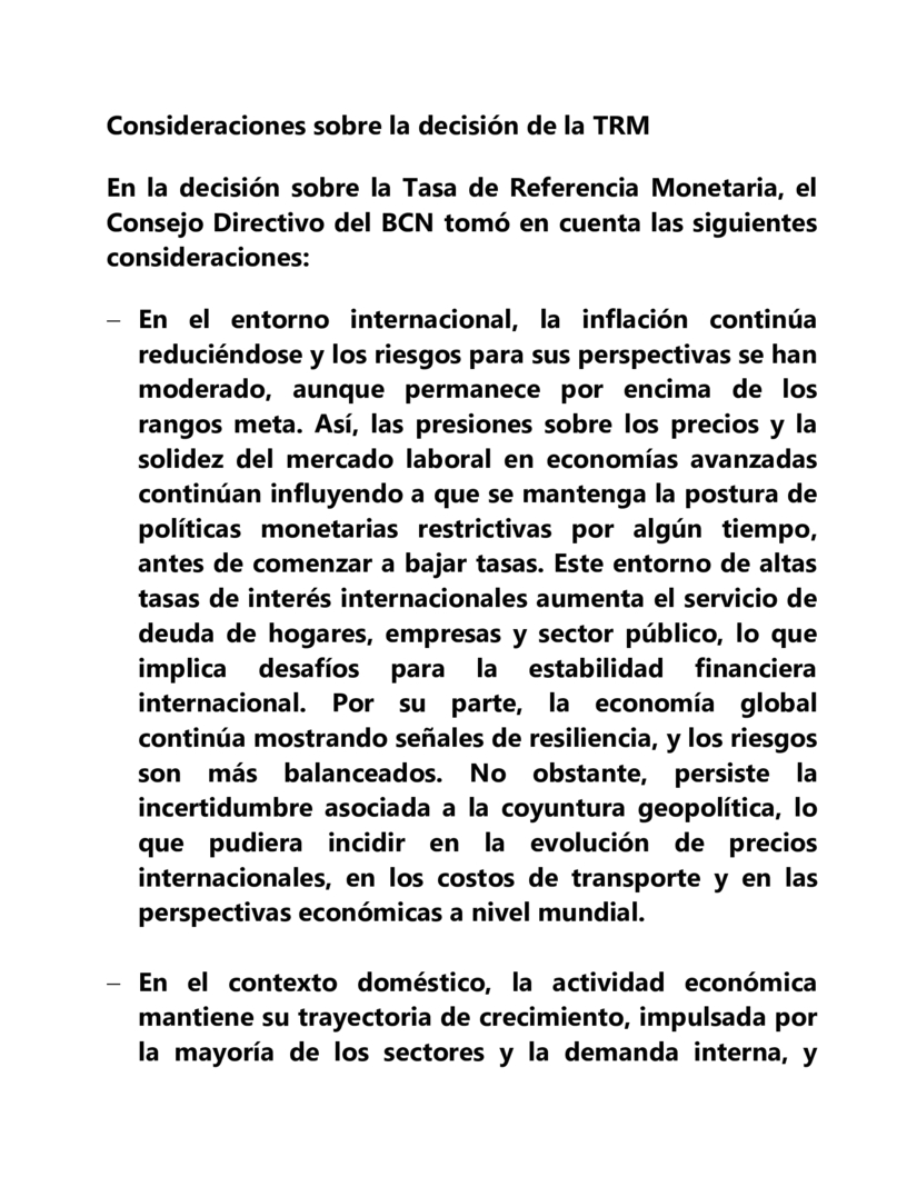 En la decisión sobre la Tasa de Referencia Monetaria, el Consejo Directivo del BCN tomó en cuenta las siguientes consideraciones: