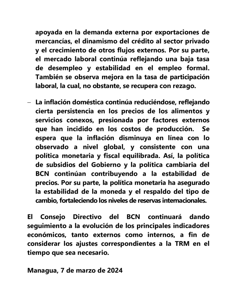 El Consejo Directivo del BCN continuará dando seguimiento a la evolución de los principales indicadores económicos, tanto externos como internos, a fin de considerar los ajustes correspondientes a la TRM en el tiempo que sea necesario.