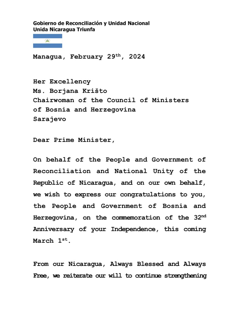 On behalf of the People and Government of Reconciliation and National Unity of the Republic of Nicaragua, and on our own behalf, we wish to express our congratulations to you, the People and Government of Bosnia and Herzegovina, on the commemoration of the 32nd Anniversary of your Independence, this coming March 1st.
