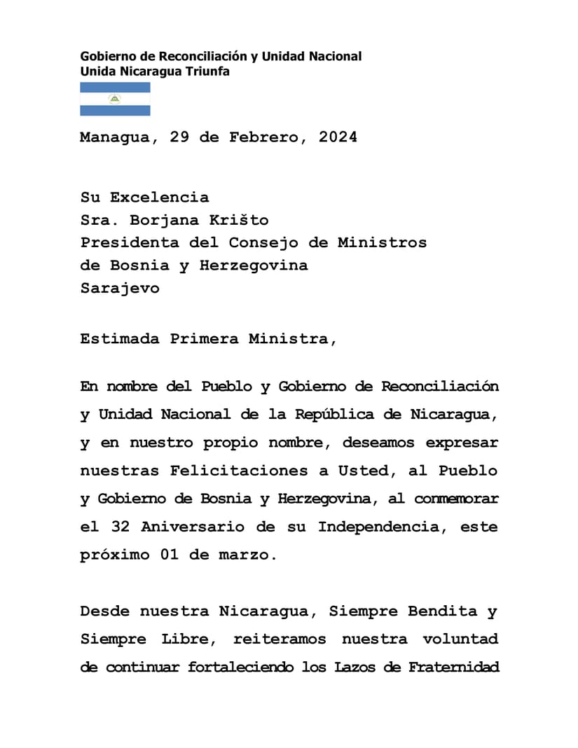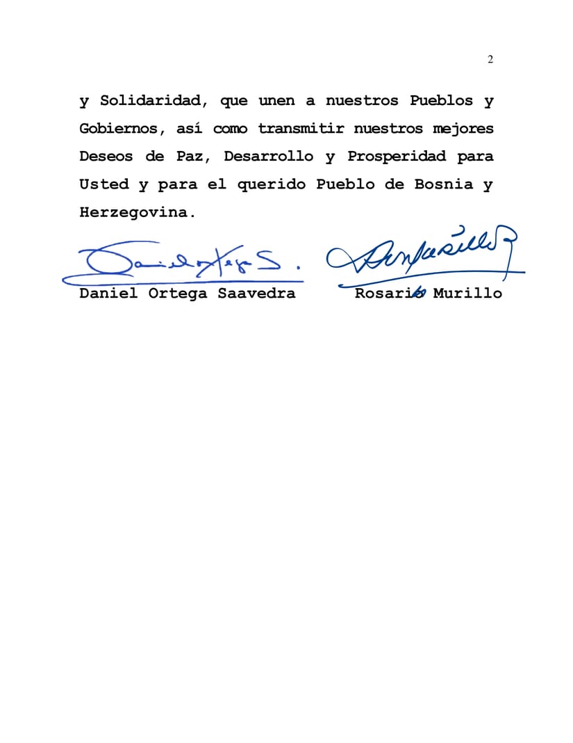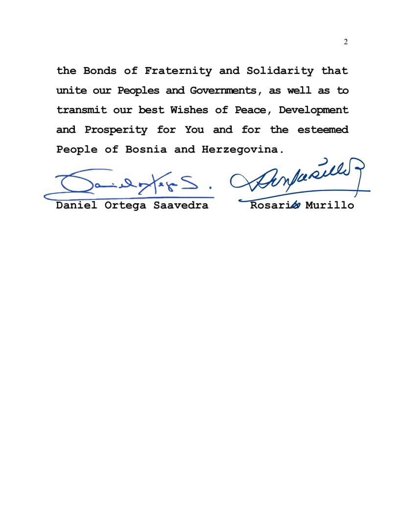 Desde nuestra Nicaragua, Siempre Bendita y Siempre Libre, reiteramos nuestra voluntad de continuar fortaleciendo los Lazos de Fraternidad y Solidaridad, que unen a nuestros Pueblos y Gobiernos, así como transmitir nuestros mejores Deseos de Paz, Desarrollo y Prosperidad para Usted y para el querido Pueblo de Bosnia y Herzegovina.