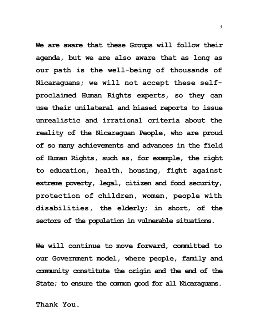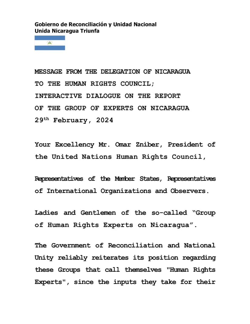 MESSAGE FROM THE DELEGATION OF NICARAGUA TO THE HUMAN RIGHTS COUNCIL; INTERACTIVE DIALOGUE ON THE REPORT OF THE GROUP OF EXPERTS ON NICARAGUA