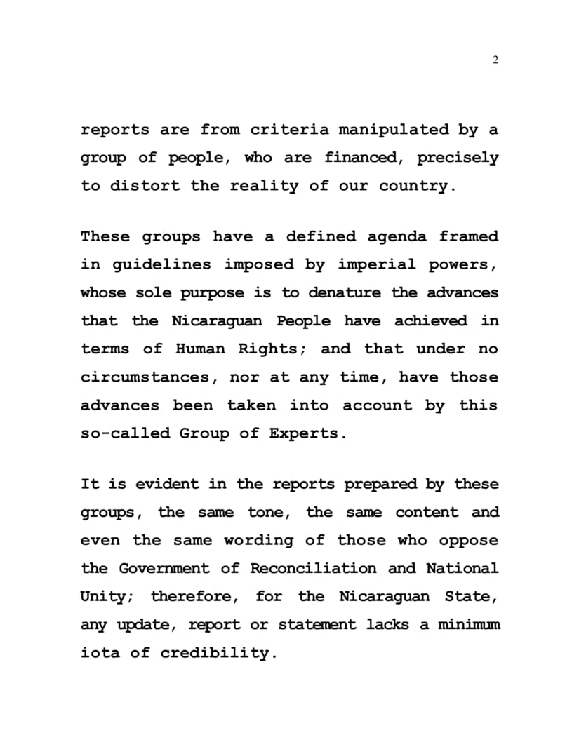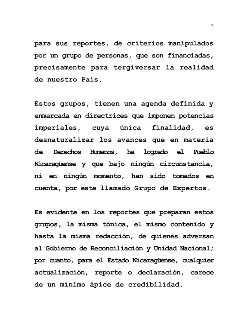 El Gobierno de Reconciliación y Unidad Nacional, reitera de forma fehaciente, su posición respecto a estos Grupos que se hacen llamar “Expertos en Derechos Humanos”, por cuanto toman los insumos para sus reportes, de criterios manipulados por un grupo de personas, que son financiadas, precisamente para tergiversar la realidad de nuestro País.