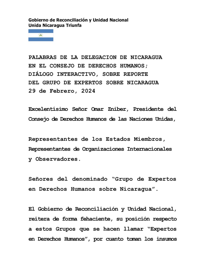 Palabras de nuestro Gobierno, pronunciadas por la Compañera Wendy Morales, Procuradora General de la República, en el Consejo de Derechos Humanos de las Naciones Unidas : “Diálogo Interactivo con el Grupo de Expertos sobre Nicaragua”, realizado hoy 29 de Febrero del 2024.