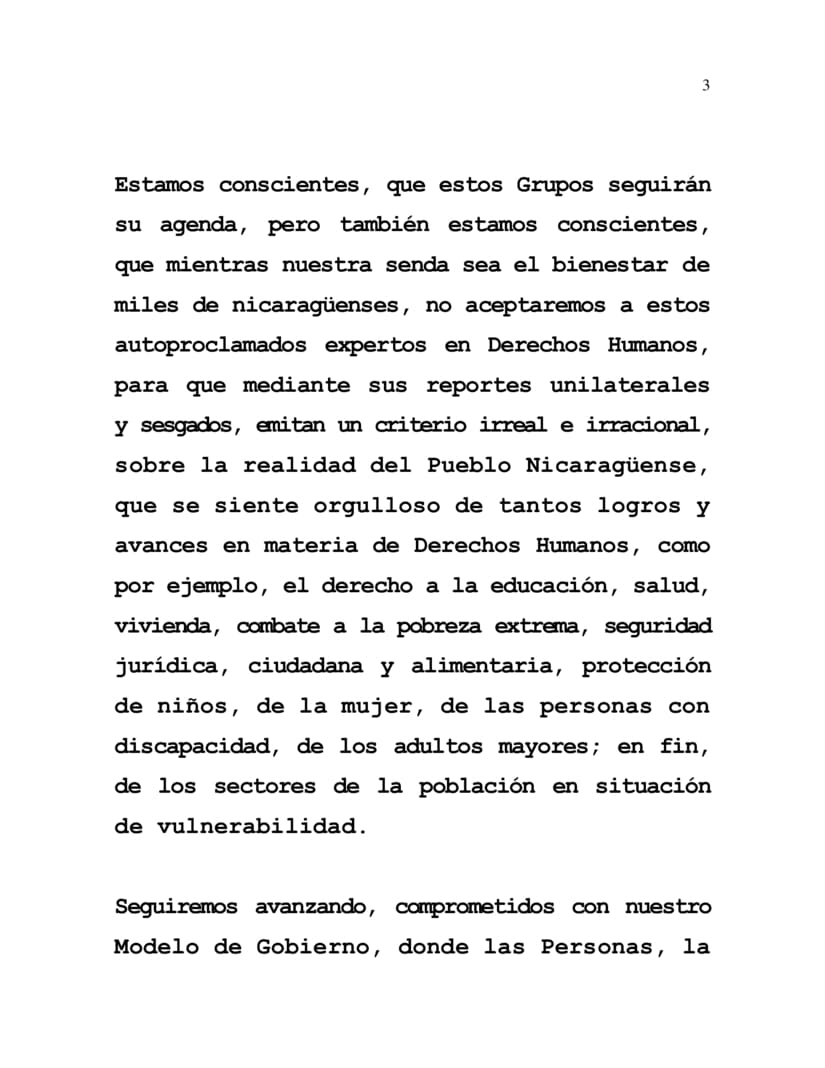 Estamos conscientes, que estos Grupos seguirán su agenda, pero también estamos conscientes, que mientras nuestra senda sea el bienestar de miles de nicaragüenses, no aceptaremos a estos autoproclamados expertos en Derechos Humanos, para que mediante sus reportes unilaterales y sesgados, emitan un criterio irreal e irracional, sobre la realidad del Pueblo Nicaragüense, que se siente orgulloso de tantos logros y avances en materia de Derechos Humanos, como por ejemplo, el derecho a la educación, salud, vivienda, combate a la pobreza extrema, seguridad jurídica, ciudadana y alimentaria, protección de niños, de la mujer, de las personas con discapacidad, de los adultos mayores; en fin, de los sectores de la población en situación de vulnerabilidad.