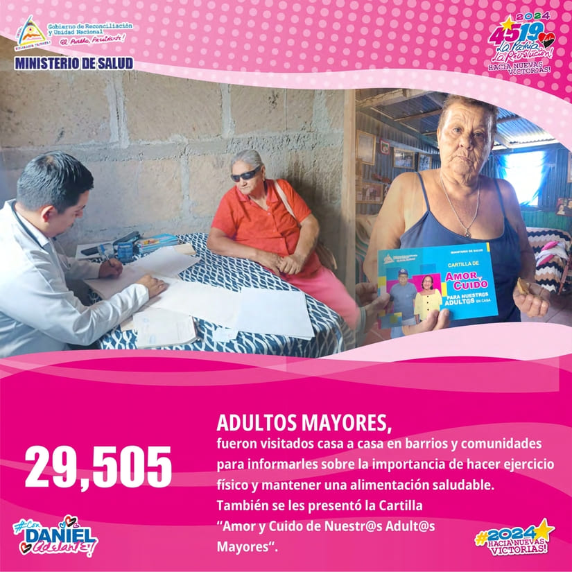 - 29,505 Adult@s Mayores visitados en sus casas en Barrios y Comunidades para informarles sobre la importancia de hacer ejercicio físico y mantener una alimentación saludable, y se les presentó la Cartilla “Amor y Cuido de Nuestr@s Adult@s Mayores”.