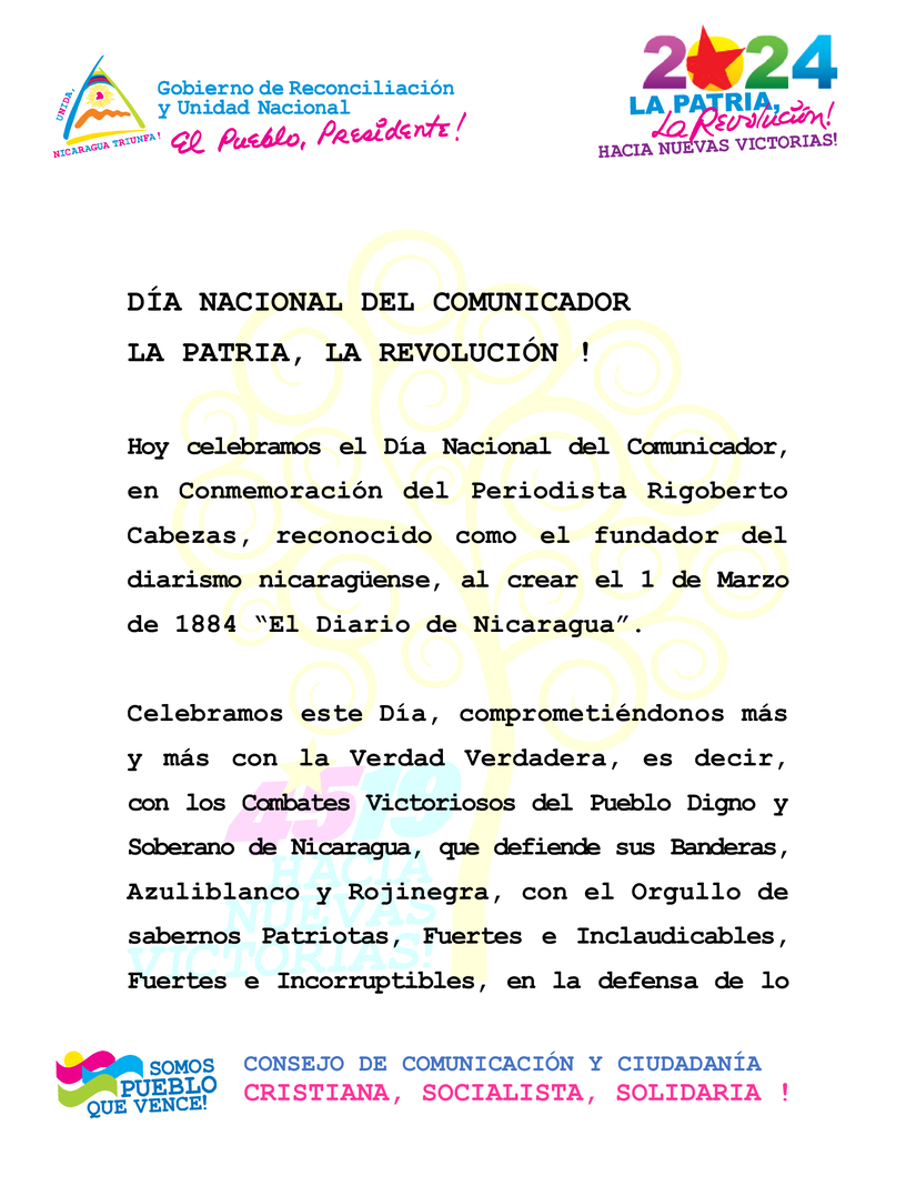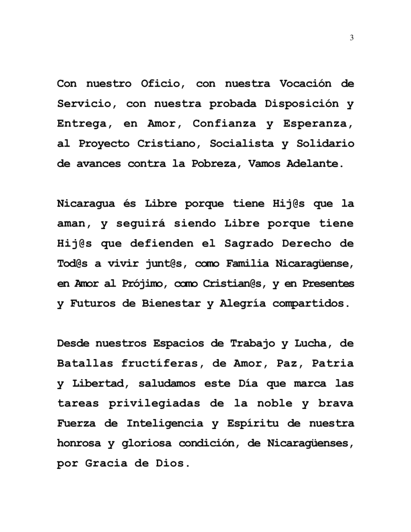 Desde nuestros Espacios de Trabajo y Lucha, de Batallas fructíferas, de Amor, Paz, Patria y Libertad, saludamos este Día que marca las tareas privilegiadas de la noble y brava Fuerza de Inteligencia y Espíritu de nuestra honrosa y gloriosa condición, de Nicaragüenses, por Gracia de Dios.