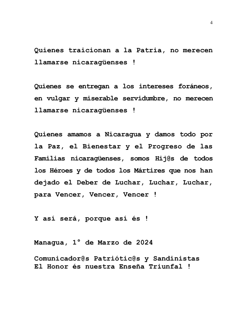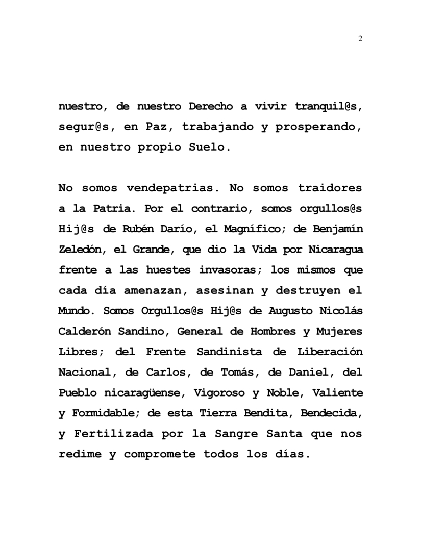 No somos vendepatrias. No somos traidores a la Patria. Por el contrario, somos orgullos@s Hij@s de Rubén Darío, el Magnífico; de Benjamín Zeledón, el Grande, que dio la Vida por Nicaragua frente a las huestes invasoras; los mismos que cada día amenazan, asesinan y destruyen el Mundo. Somos Orgullos@s Hij@s de Augusto Nicolás Calderón Sandino, General de Hombres y Mujeres Libres; del Frente Sandinista de Liberación Nacional, de Carlos, de Tomás, de Daniel, del Pueblo nicaragüense, Vigoroso y Noble, Valiente y Formidable; de esta Tierra Bendita, Bendecida, y Fertilizada por la Sangre Santa que nos redime y compromete todos los días.
