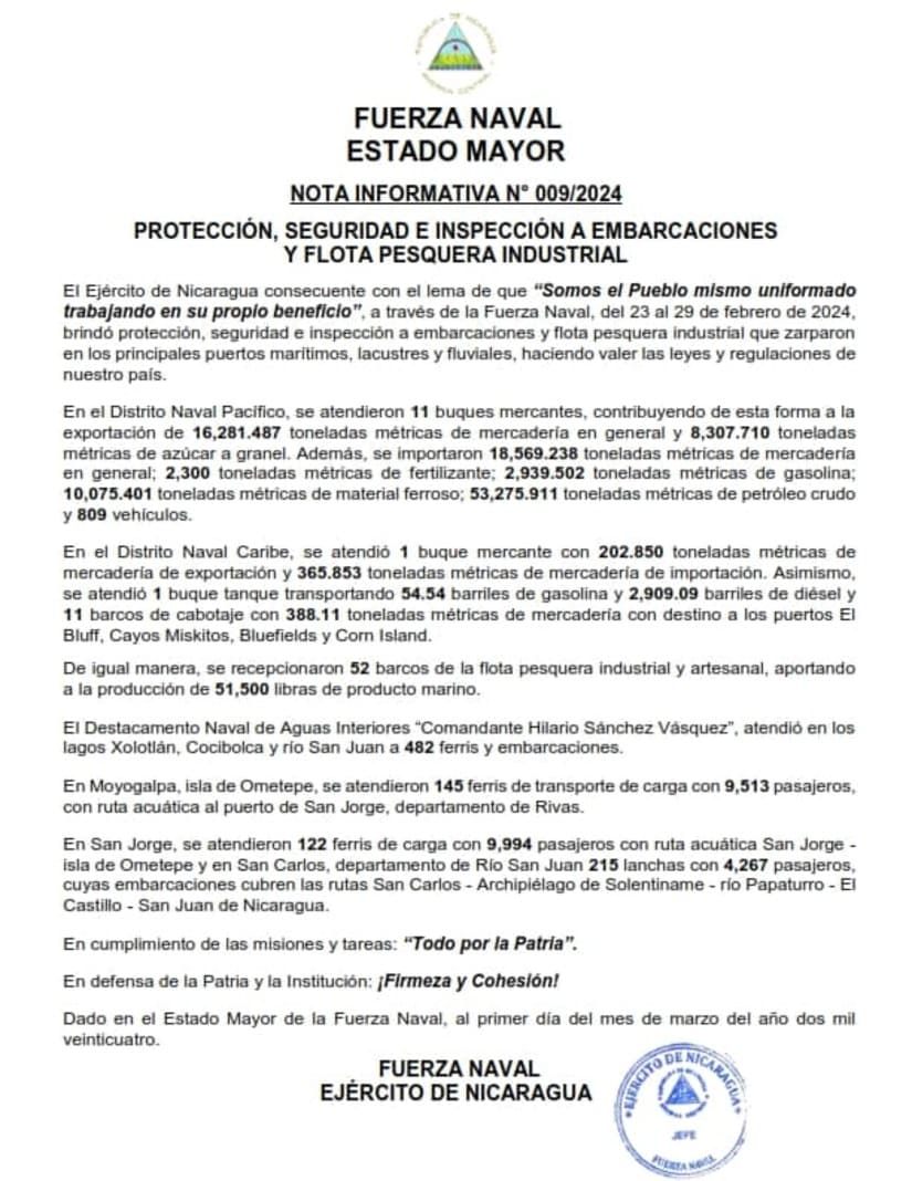 El Ejército de Nicaragua consecuente con el lema de que “Somos el Pueblo mismo uniformado trabajando en su propio beneficio”, a través de la Fuerza Naval, del 23 al 29 de febrero de 2024, brindó protección, seguridad e inspección a embarcaciones y flota pesquera industrial que zarparon en los principales puertos marítimos, lacustres y fluviales, haciendo valer las leyes y regulaciones de nuestro país.