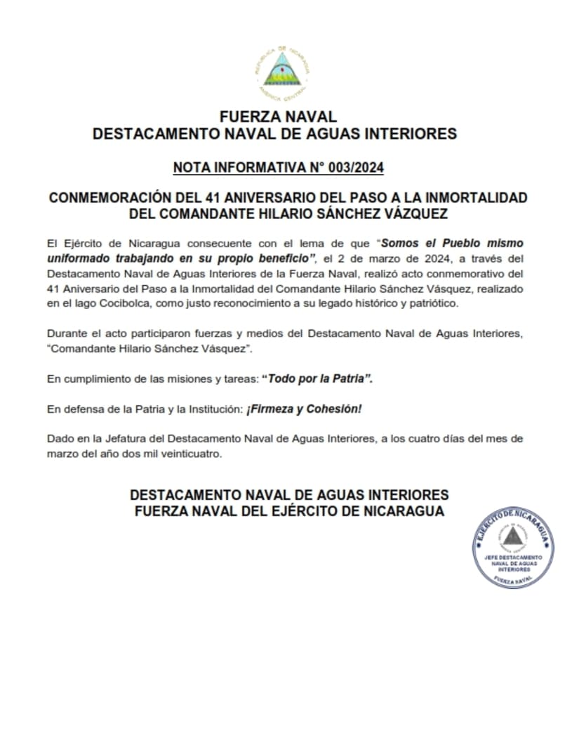 El Ejército de Nicaragua consecuente con el lema de que “Somos el Pueblo mismo uniformado trabajando en su propio beneficio”, el 2 de marzo de 2024, a través del Destacamento Naval de Aguas Interiores de la Fuerza Naval, realizó acto conmemorativo del 41 Aniversario del Paso a la Inmortalidad del Comandante Hilario Sánchez Vásquez, realizado en el lago Cocibolca, como justo reconocimiento a su legado histórico y patriótico.