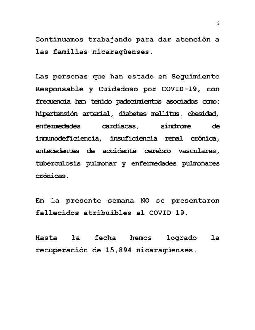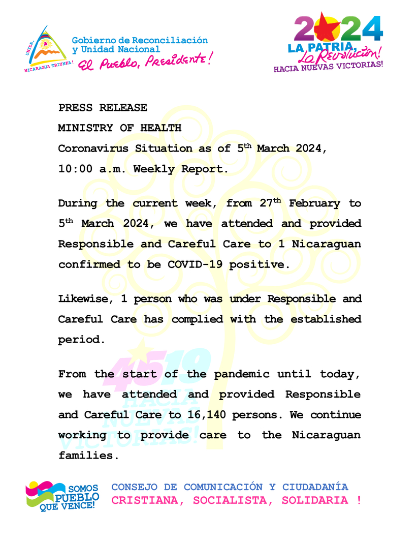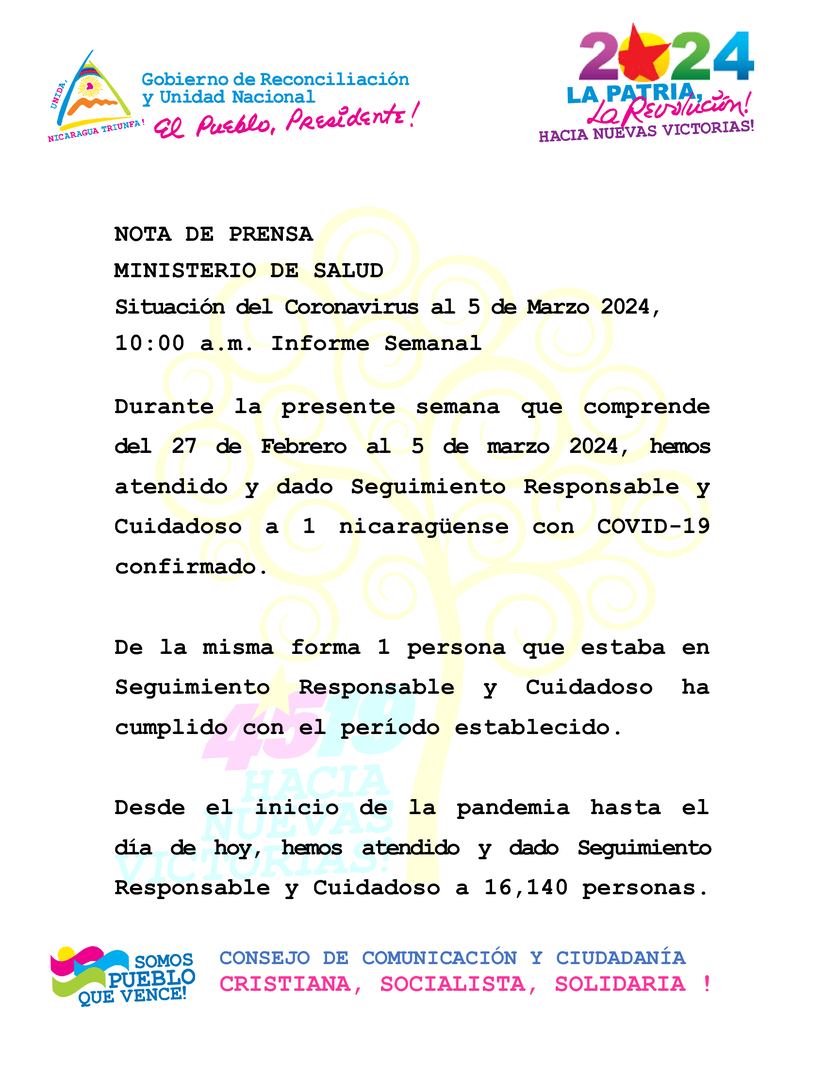 Durante la presente semana que comprende del 27 de Febrero al 5 de marzo 2024, hemos atendido y dado Seguimiento Responsable y Cuidadoso a 1 nicaragüense con COVID-19 confirmado.