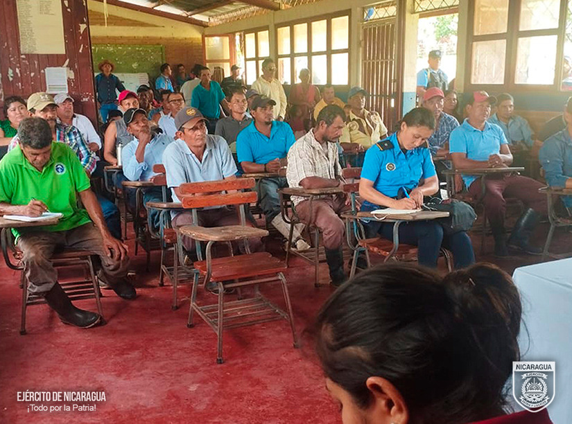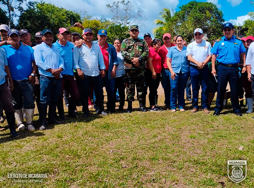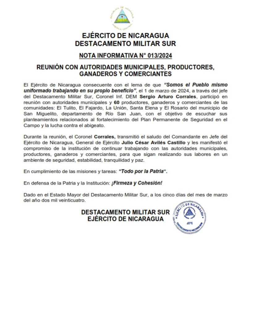 El Ejército de Nicaragua consecuente con el lema de que “Somos el Pueblo mismo uniformado trabajando en su propio beneficio”, el 1 de marzo de 2024, a través del jefe del Destacamento Militar Sur, Coronel Inf. DEM Sergio Arturo Corrales, participó en reunión con autoridades municipales y 60 productores, ganaderos y comerciantes de las comunidades: El Tulito, El Fajardo, La Unión, Santa Elena y El Rosario del municipio de San Miguelito, departamento de Río San Juan, con el objetivo de escuchar sus planteamientos relacionados al fortalecimiento del Plan Permanente de Seguridad en el Campo y la lucha contra el abigeato.