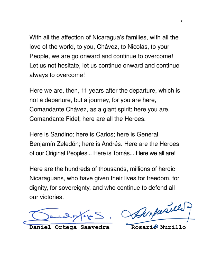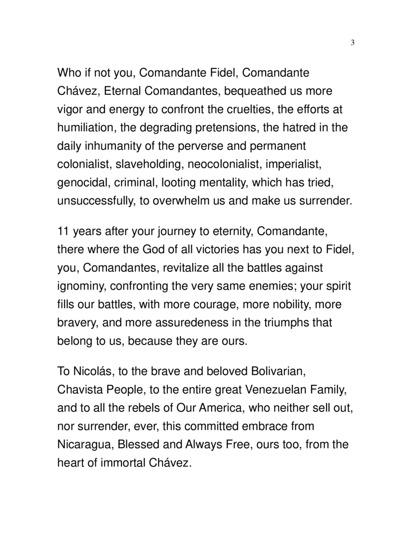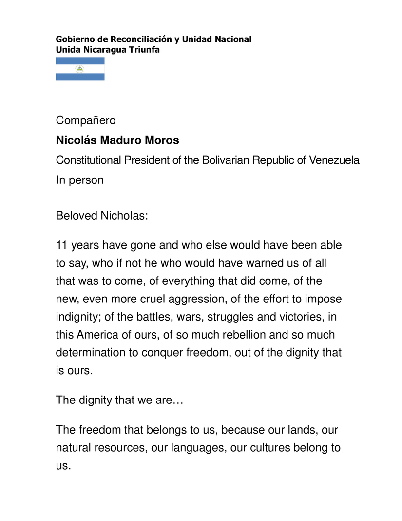 A Nicolás, a ese bravo y querido pueblo bolivariano, chavista, a toda la gran familia venezolana, y a todos los rebeldes nuestroamericanos, que no aceptamos vendernos, ni rendirnos, jamás, el abrazo comprometido, nuestro, de Nicaragua bendita y siempre libre, desde el corazón de Chávez inmortal.