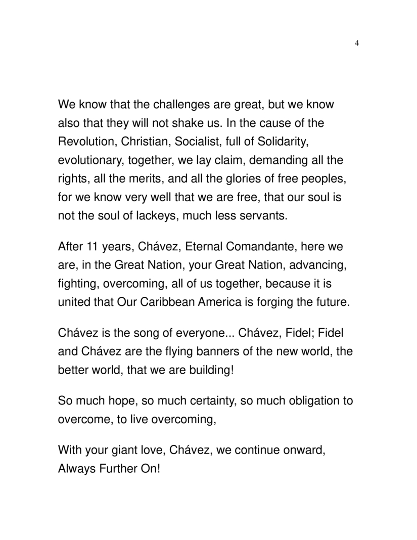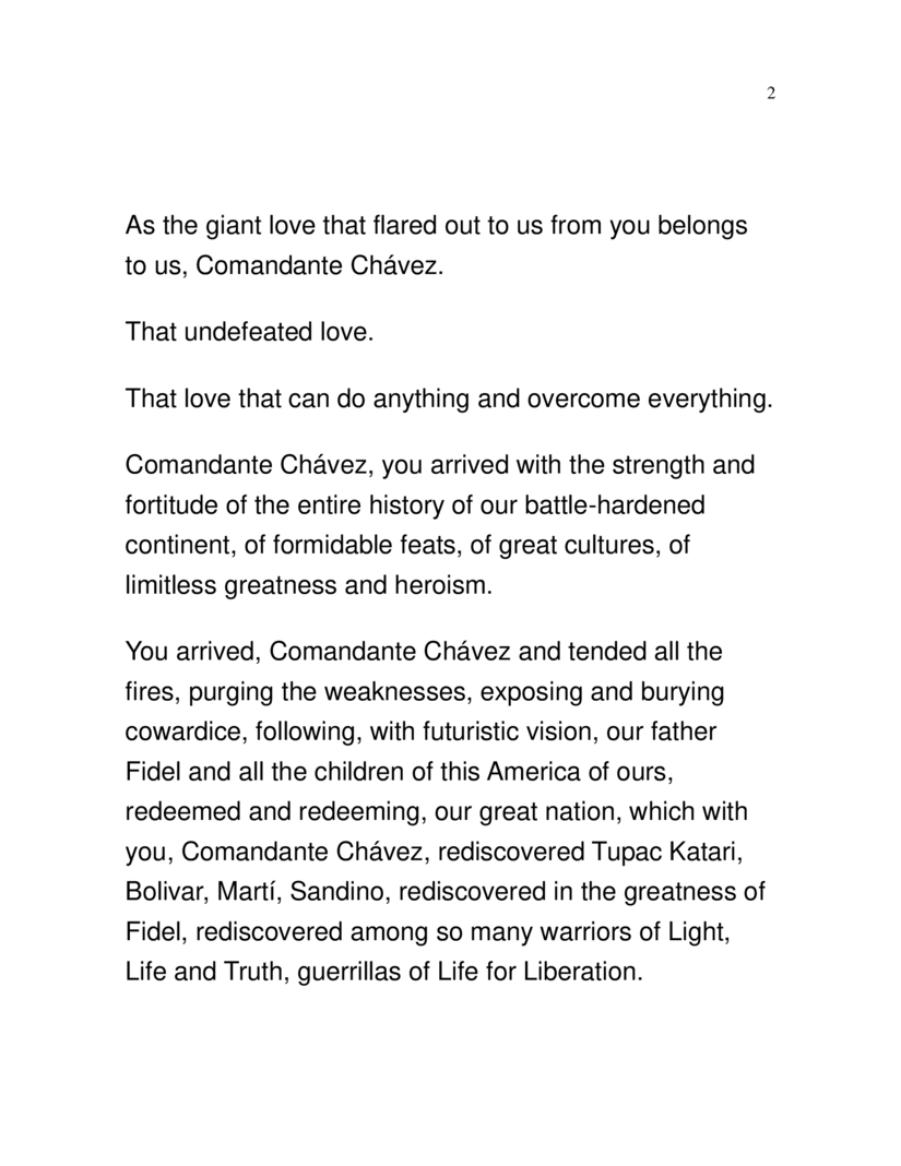 Llegaste, Comandante Chávez y avivaste todos los incendios, depurando las flaquezas, y exhibiendo y enterrando cobardías, siguiendo, con visión futurista, al padre Fidel y a todos los hijos de esta América nuestra, redimida y redentora, nuestra patria grande, que con vos, Comandante Chávez, reencontró a Tupac Katari, a Bolívar, a Martí, a Sandino, y se reencontró en la grandeza de Fidel, y se reencontró entre tantos guerreros de luz, vida y verdad, guerrilleros de vida para la liberación.