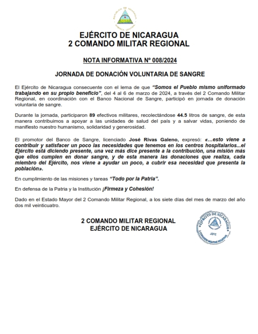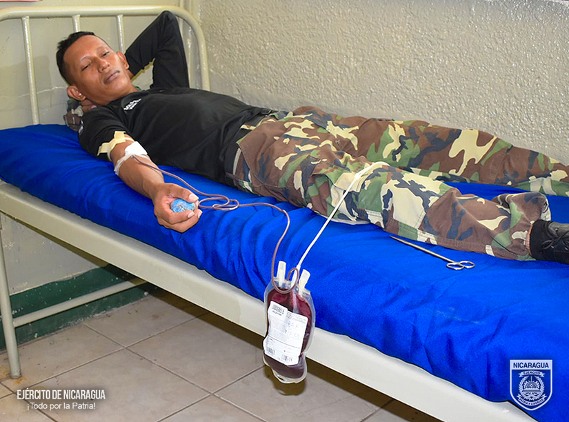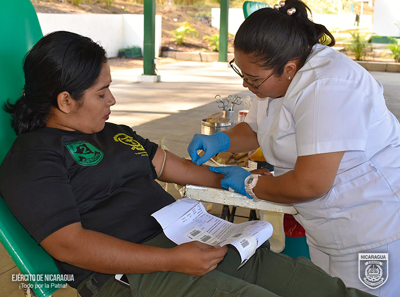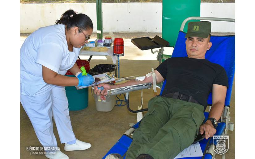 El Ejército de Nicaragua consecuente con el lema de que “Somos el Pueblo mismo uniformado trabajando en su propio beneficio”, del 4 al 6 de marzo de 2024, a través del 2 Comando Militar Regional, en coordinación con el Banco Nacional de Sangre, participó en jornada de donación voluntaria de sangre.