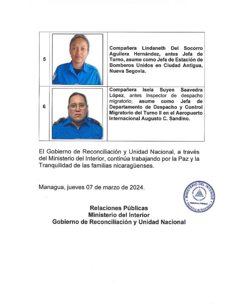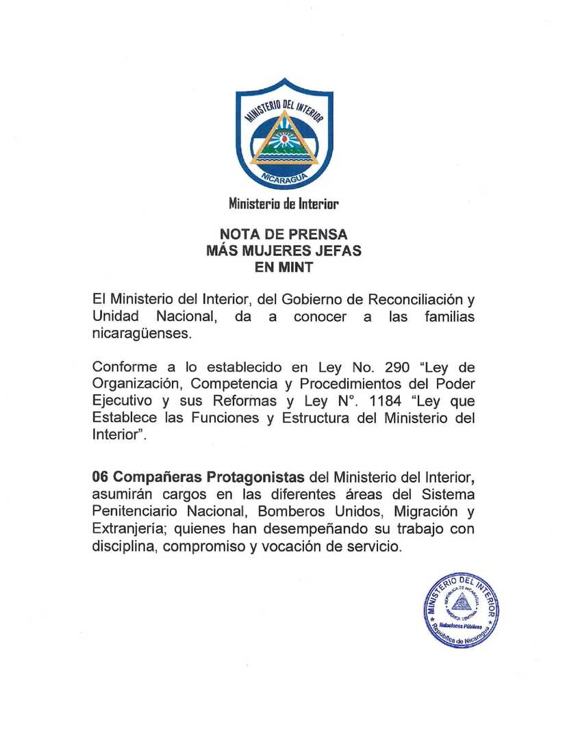El Ministerio del Interior, del Gobierno de Reconciliación y Unidad Nacional, da a conocer a las familias nicaragüenses.