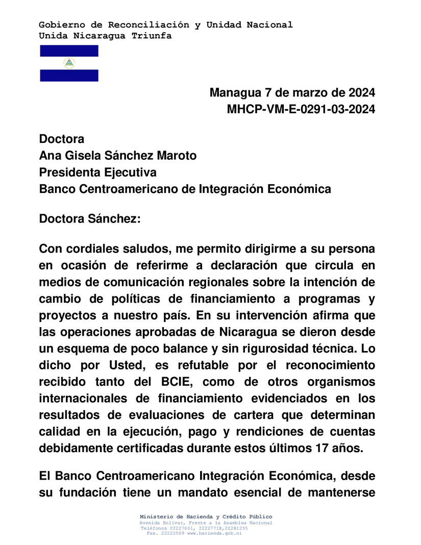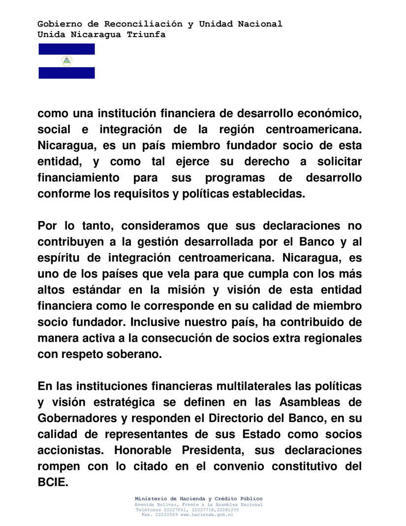 Con cordiales saludos, me permito dirigirme a su persona en ocasión de referirme a declaración que circula en medios de comunicación regionales sobre la intención de cambio de políticas de financiamiento a programas y proyectos a nuestro país. En su intervención afirma que las operaciones aprobadas de Nicaragua se dieron desde un esquema de poco balance y sin rigurosidad técnica. Lo dicho por Usted, es refutable por el reconocimiento recibido tanto del BCIE, como de otros organismos internacionales de financiamiento evidenciados en los resultados de evaluaciones de cartera que determinan calidad en la ejecución, pago y rendiciones de cuentas debidamente certificadas durante estos últimos 17 años.