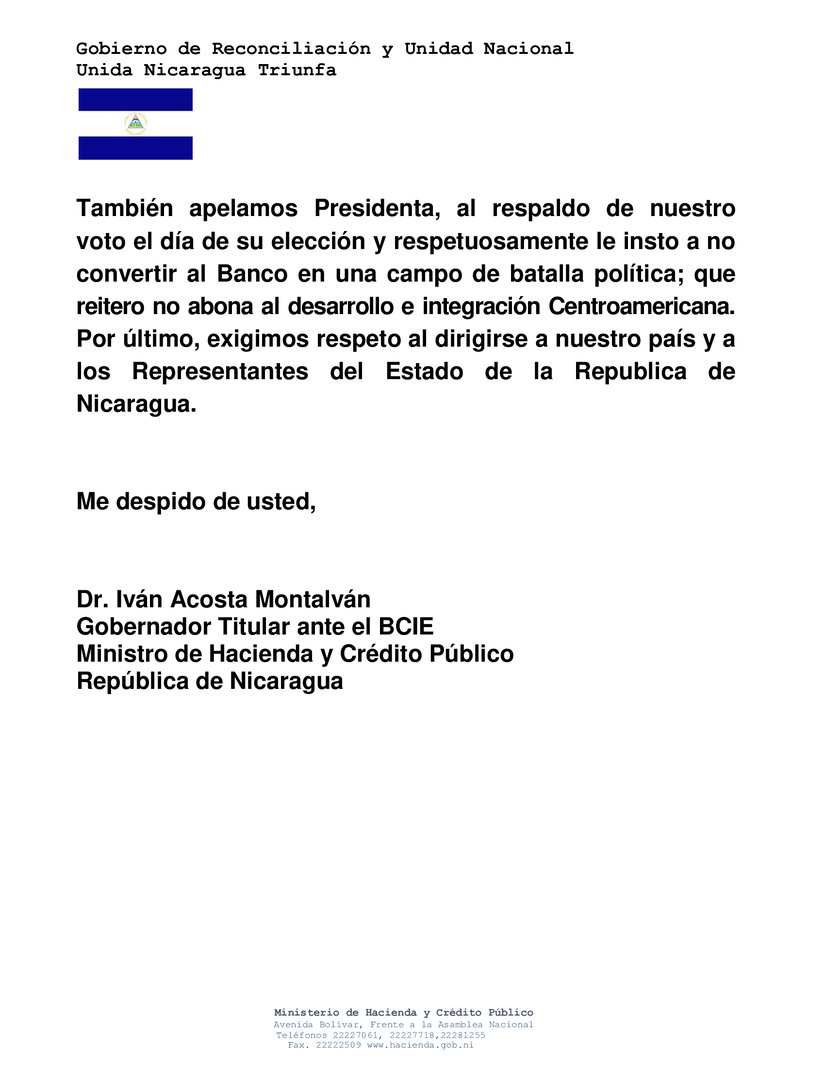 También apelamos Presidenta, al respaldo de nuestro voto el día de su elección y respetuosamente le insto a no convertir al Banco en una campo de batalla política; que reitero no abona al desarrollo e integración Centroamericana. Por último, exigimos respeto al dirigirse a nuestro país y a los Representantes del Estado de la Republica de Nicaragua.