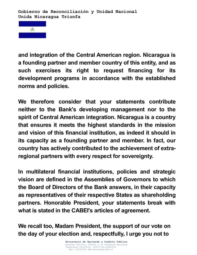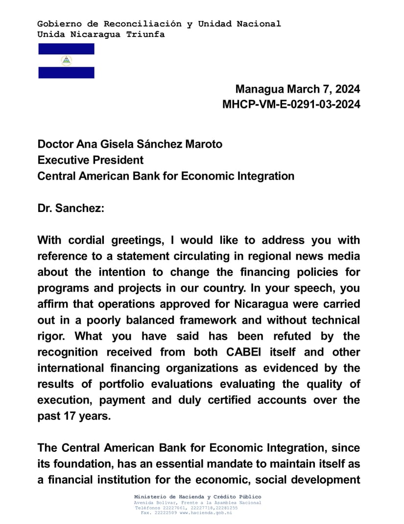 With cordial greetings, I would like to address you with reference to a statement circulating in regional news media about the intention to change the financing policies for programs and projects in our country. In your speech, you affirm that operations approved for Nicaragua were carried out in a poorly balanced framework and without technical rigor. What you have said has been refuted by the recognition received from both CABEI itself and other international financing organizations as evidenced by the results of portfolio evaluations evaluating the quality of execution, payment and duly certified accounts over the past 17 years.