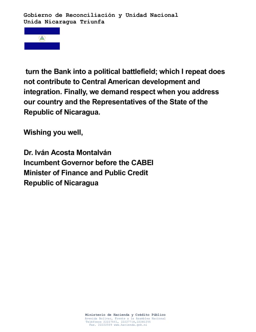 Carta enviada hoy por el Ministro de Hacienda y Crédito Público, Compañero Iván Acosta, a la Presidenta del Banco Centroamericano de Integración Económica.
