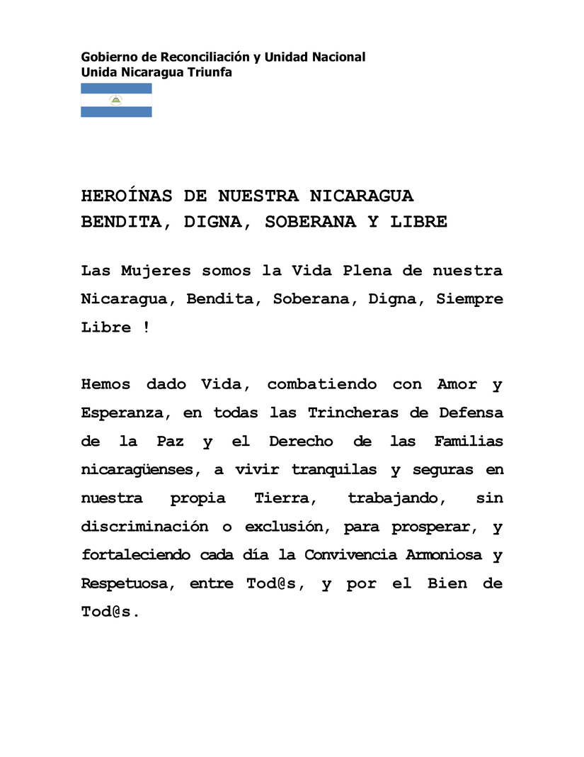 Among all the aggressions of the Imperialists of the Earth, and thanks to the Dignity and Courage of our Women, Men, Youth and Families, Nicaragua has strengthened its Patriotism and its Awareness of Rights for Everyone.
