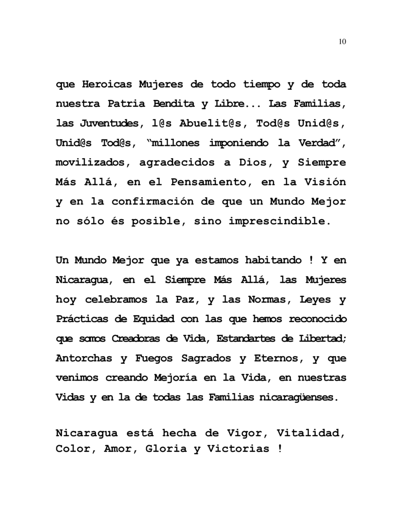 But They Could Not Prevail, Nor Will They! For here we are, the heroic Nicaraguan People... The most Heroic Women of all the eras and of all our Nation, Blessed and Free... Its Families, its Youth, its Grandparents, Everyone United, United All "millions imposing the Truth”, motivated, grateful to God, and Always Further On, in the Thought, in the Vision, in the Conviction that a Better World is not only possible, but essential.