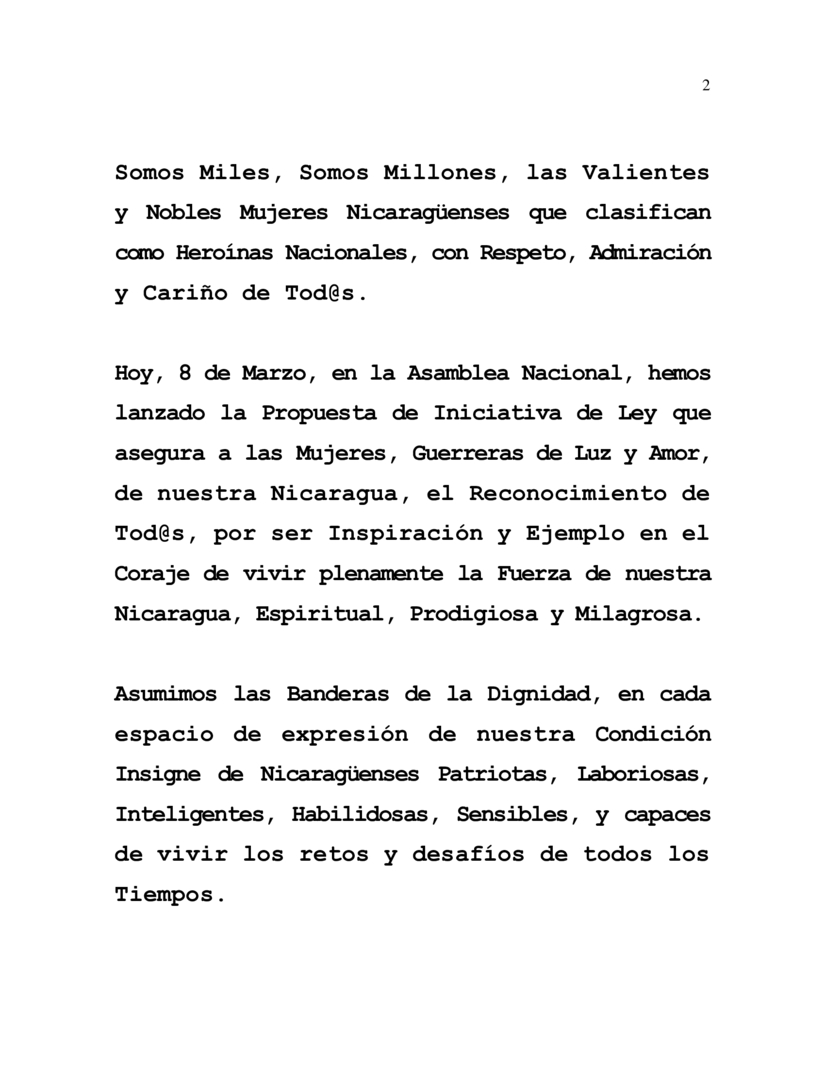 Today, March 8th in the National Assembly, we have launched the Proposed Legislation assuring for Women, Our Nicaragua’s Warriors of Light and Love, the Recognition of Everyone, for being the Inspiration and Example of the Courage to fully live out the Strength of our Nicaragua, Spiritual, Prodigious, Miraculous.