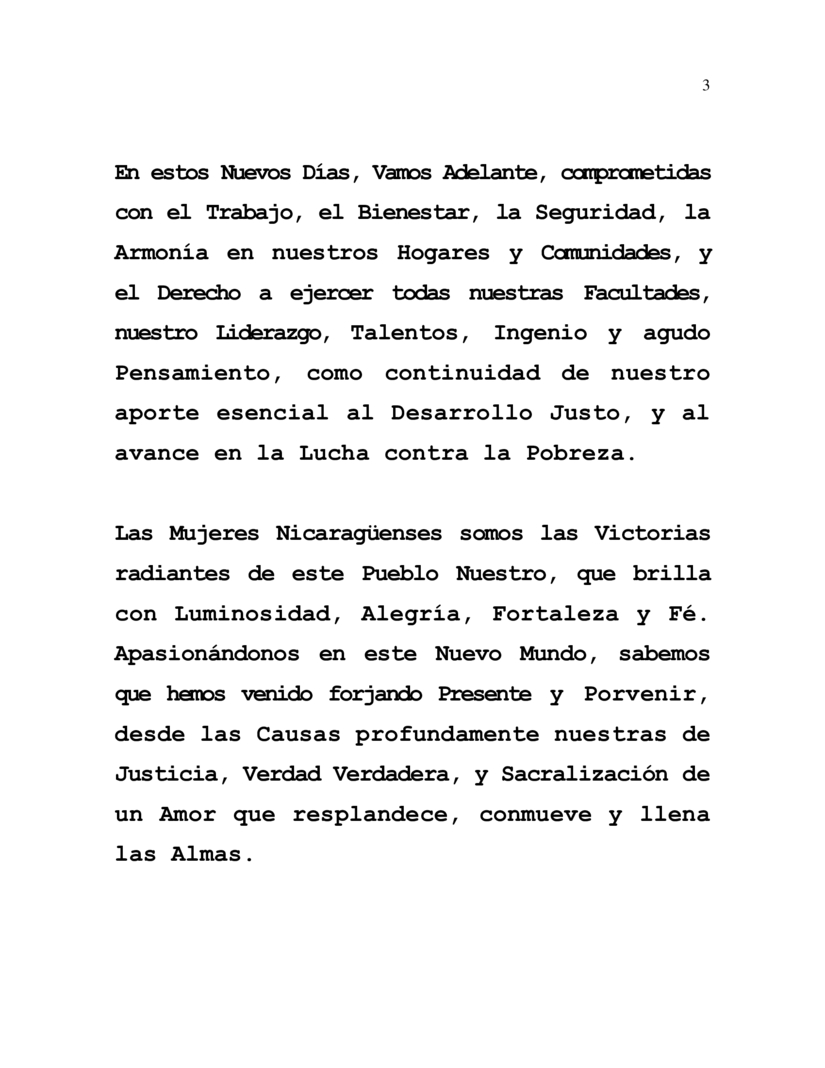 Las Mujeres Nicaragüenses somos las Victorias radiantes de este Pueblo Nuestro, que brilla con Luminosidad, Alegría, Fortaleza y Fé. Apasionándonos en este Nuevo Mundo, sabemos que hemos venido forjando Presente y Porvenir, desde las Causas profundamente nuestras de Justicia, Verdad Verdadera, y Sacralización de un Amor que resplandece, conmueve y llena las Almas.