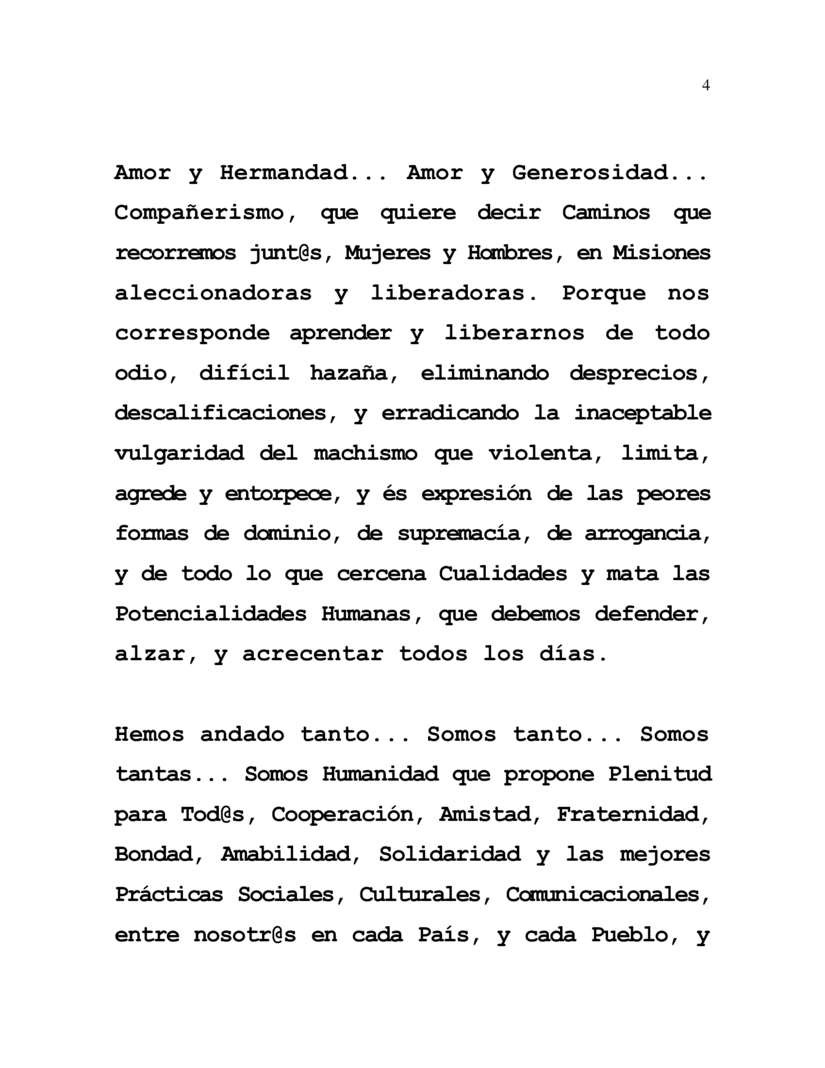 Love and Brotherhood... Love and Generosity... Companionship, which means all the Paths we travel together, Women and Men, in sobering and liberating Missions. Because it is up to us to learn and to free ourselves from all hatred, a difficult feat, eliminating slights, disqualifications, and eradicating the unacceptable vulgarity of machismo that violates, limits, attacks and hinders and is an expression of the worst forms of domination, supremacy, arrogance, and everything that cuts short Qualities and kills Human Potentialities, which we must defend, raise, and increase every day.