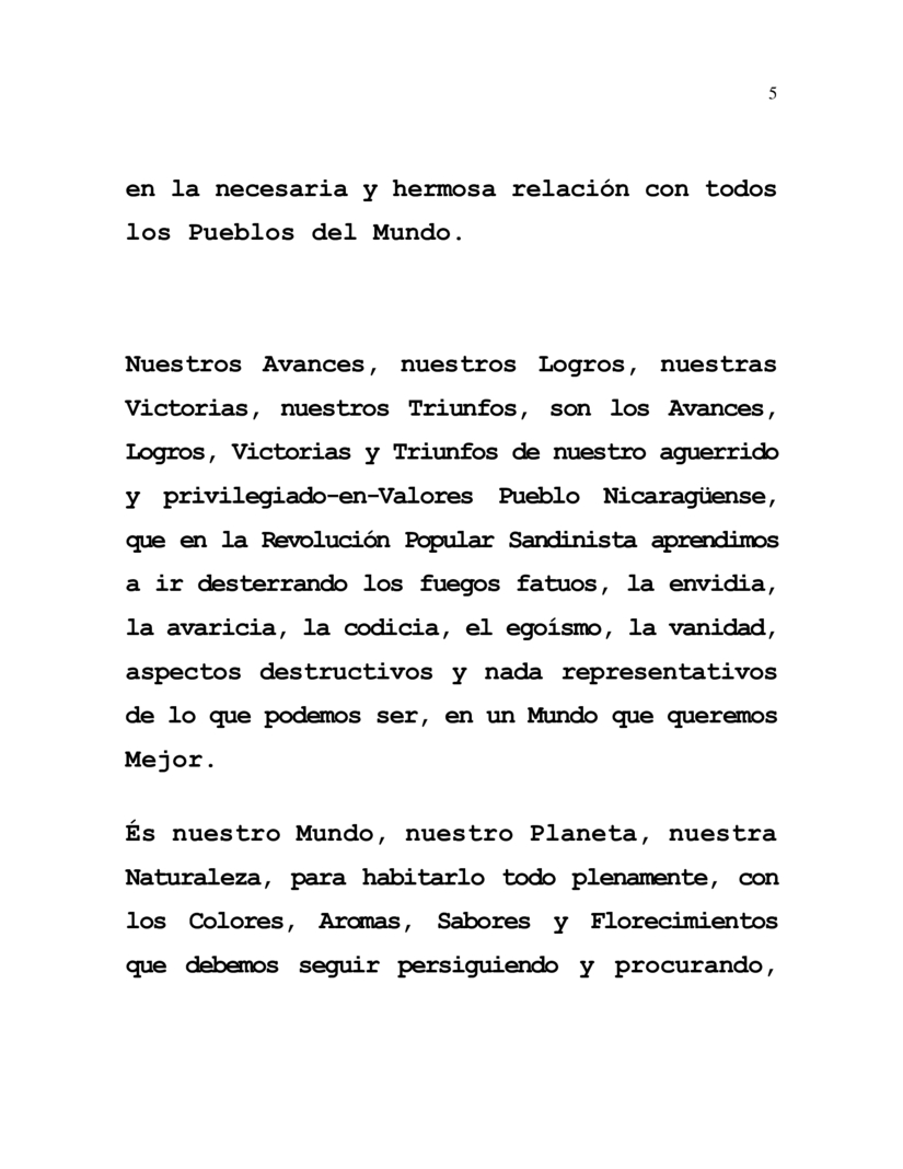 Our Advances, our Achievements, our Victories, our Triumphs, are the Advances, Achievements, Victories and Triumphs of our brave and Values-endowed Nicaraguan People, who in the Sandinista Popular Revolution learned to banish the will-o'-the-wisps of envy, greed, avarice, selfishness, vanity, destructive traits in no way representative of what we can be, in a World that we want to be Better.