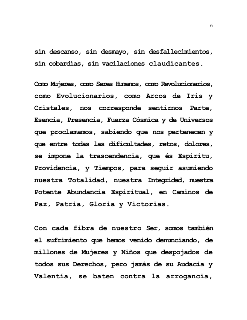 Como Mujeres, como Seres Humanos, como Revolucionarios, como Evolucionarios, como Arcos de Iris y Cristales, nos corresponde sentirnos Parte, Esencia, Presencia, Fuerza Cósmica y de Universos que proclamamos, sabiendo que nos pertenecen y que entre todas las dificultades, retos, dolores, se impone la trascendencia, que és Espíritu, Providencia, y Tiempos, para seguir asumiendo nuestra Totalidad, nuestra Integridad, nuestra Potente Abundancia Espiritual, en Caminos de Paz, Patria, Gloria y Victorias.