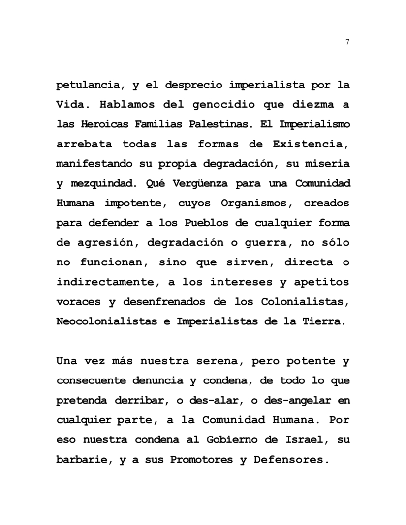 Con cada fibra de nuestro Ser, somos también el sufrimiento que hemos venido denunciando, de millones de Mujeres y Niños que despojados de todos sus Derechos, pero jamás de su Audacia y Valentía, se baten contra la arrogancia, petulancia, y el desprecio imperialista por la Vida. Hablamos del genocidio que diezma a las Heroicas Familias Palestinas. El Imperialismo arrebata todas las formas de Existencia, manifestando su propia degradación, su miseria y mezquindad. Qué Vergüenza para una Comunidad Humana impotente, cuyos Organismos, creados para defender a los Pueblos de cualquier forma de agresión, degradación o guerra, no sólo no funcionan, sino que sirven, directa o indirectamente, a los intereses y apetitos voraces y desenfrenados de los Colonialistas, Neocolonialistas e Imperialistas de la Tierra.