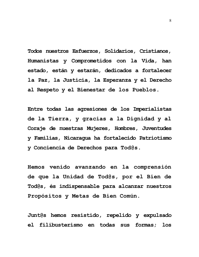 Junt@s hemos resistido, repelido y expulsado el filibusterismo en todas sus formas; los desembarcos de aventureros y forajidos, que en distintas modalidades de agresión, invasión, ocupación y pretensión de sometimiento, quisieron, por supuesto sin lograrlo, tomarse Nicaragua, para convertirla en una apagada Estrella en el insulso, deshonroso e indigno Mapa de sus conquistas.