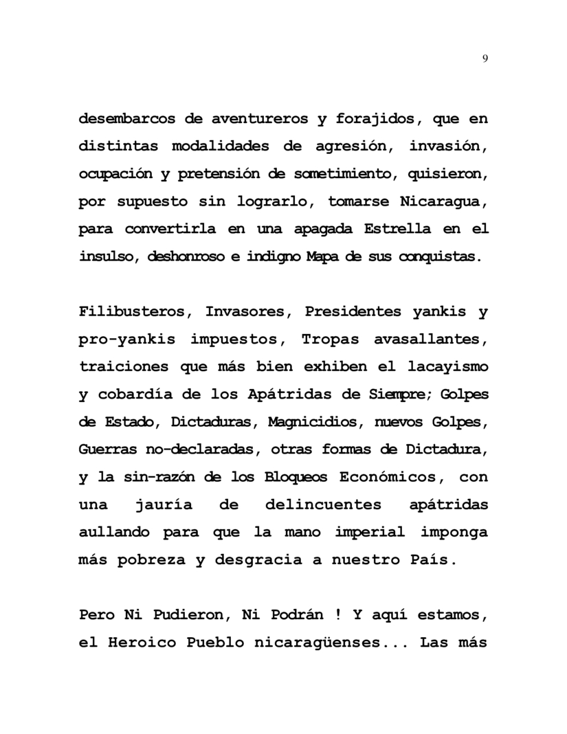 Together we have resisted, repelled and expelled every kind of filibuster, all the adventurers and outlaws, who via different forms of aggression, invasion, occupation and attempts at subjugation, wanted, of course without achieving it, to take over Nicaragua, to turn it into one more dull Star on the mediocre, dishonorable, unworthy Map of their conquests.