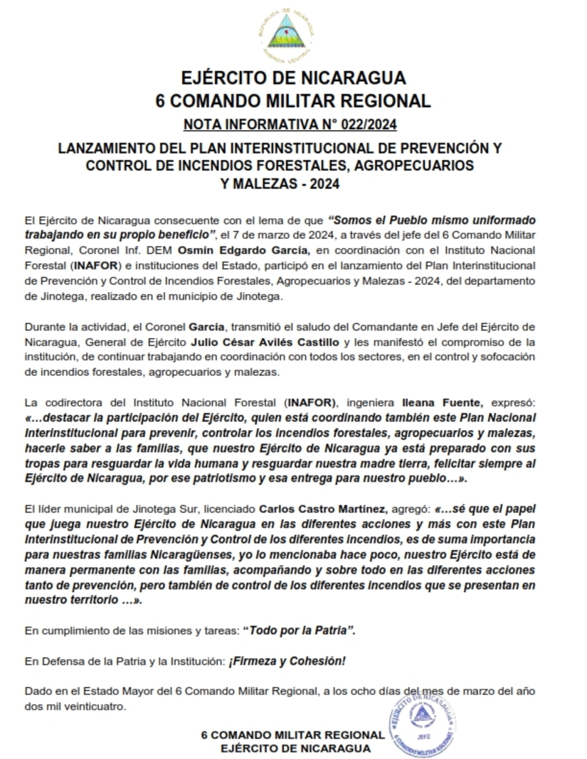 El Ejército de Nicaragua consecuente con el lema de que “Somos el Pueblo mismo uniformado trabajando en su propio beneficio”, el 7 de marzo de 2024, a través del jefe del 6 Comando Militar Regional, Coronel Inf. DEM Osmín Edgardo García, en coordinación con el Instituto Nacional Forestal (INAFOR) e instituciones del Estado, participó en el lanzamiento del Plan Interinstitucional de Prevención y Control de Incendios Forestales, Agropecuarios y Malezas - 2024, del departamento de Jinotega, realizado en el municipio de Jinotega.