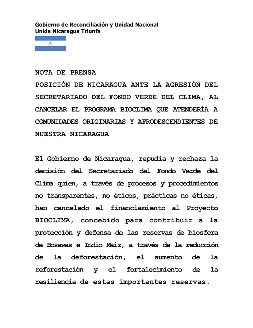 Nota de Prensa de nuestro Gobierno : Posición de Nicaragua ante la agresión del Secretariado del Fondo Verde del Clima, al cancelar el Programa Bioclima que atendería a Comunidades Originarias y Afrodescendientes de Nicaragua.