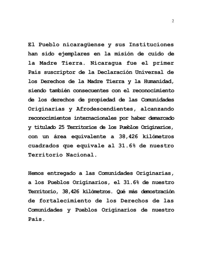 El Pueblo nicaragüense y sus Instituciones han sido ejemplares en la misión de cuido de la Madre Tierra. Nicaragua fue el primer País suscriptor de la Declaración Universal de los Derechos de la Madre Tierra y la Humanidad, siendo también consecuentes con el reconocimiento de los derechos de propiedad de las Comunidades Originarias y Afrodescendientes, alcanzando reconocimientos internacionales por haber demarcado y titulado 25 Territorios de los Pueblos Originarios, con un área equivalente a 38,426 kilómetros cuadrados que equivale al 31.6% de nuestro Territorio Nacional.