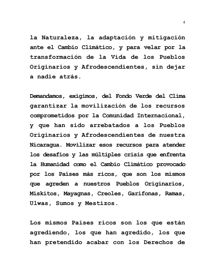 Demandamos, exigimos, del Fondo Verde del Clima garantizar la movilización de los recursos comprometidos por la Comunidad Internacional, y que han sido arrebatados a los Pueblos Originarios y Afrodescendientes de nuestra Nicaragua. Movilizar esos recursos para atender los desafíos y las múltiples crisis que enfrenta la Humanidad como el Cambio Climático provocado por los Países más ricos, que son los mismos que agreden a nuestros Pueblos Originarios, Mískitos, Mayagnas, Creoles, Garífonas, Ramas, Ulwas, Sumos y Mestizos.