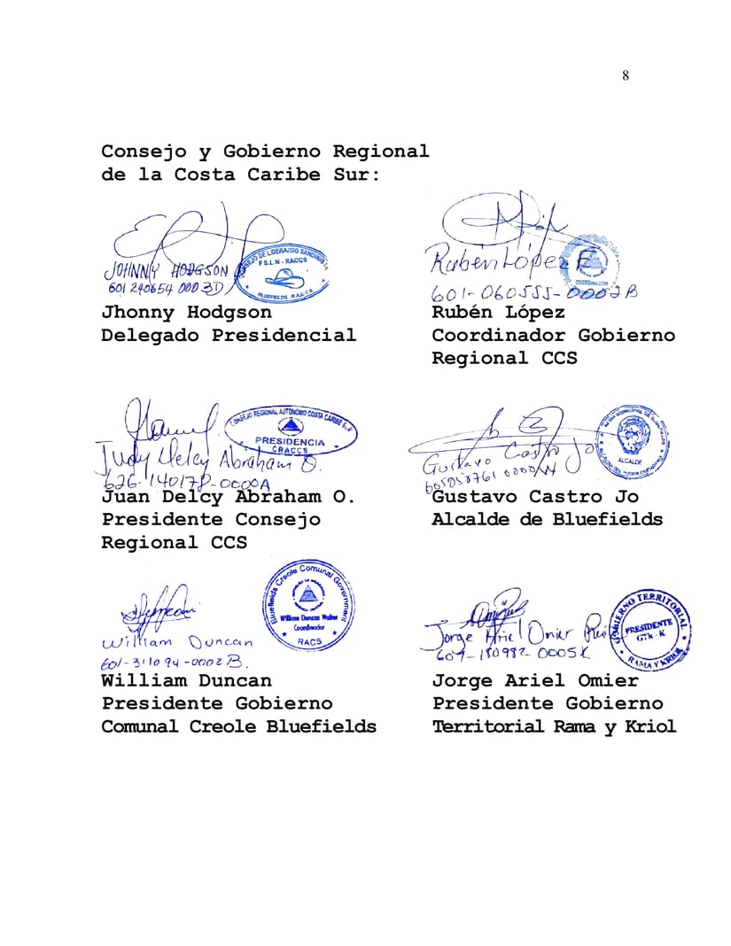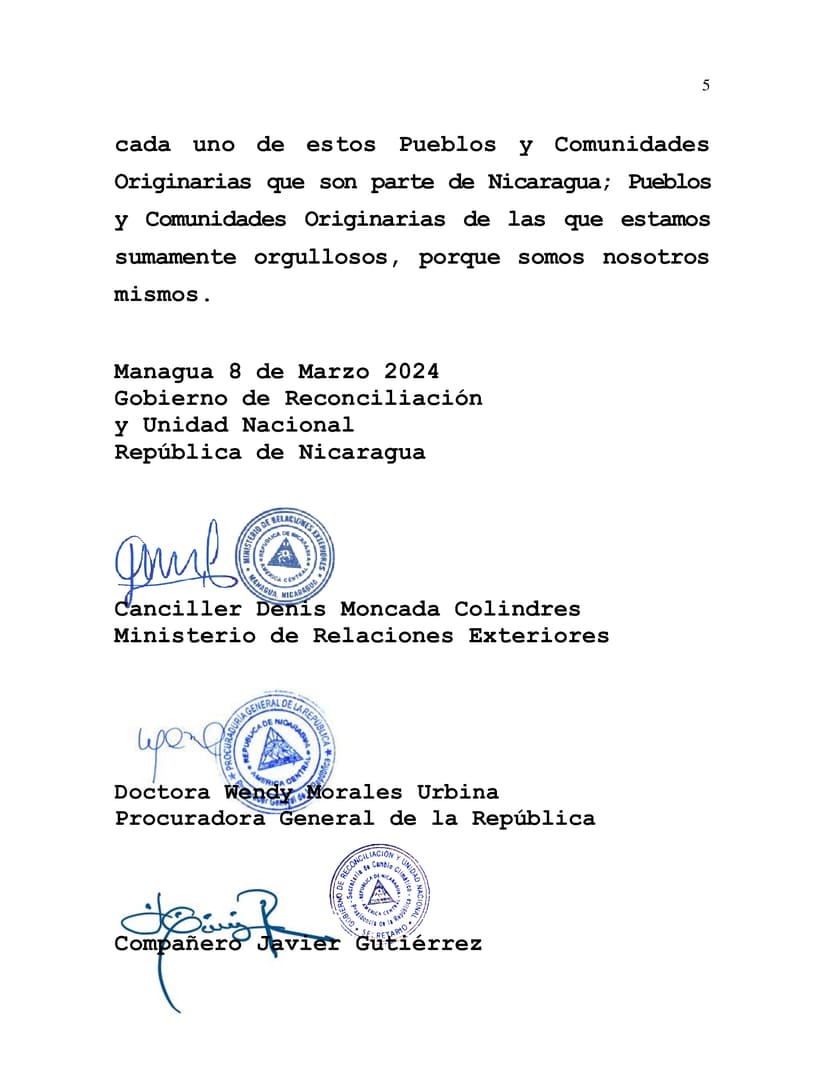 Por lo tanto, el Gobierno de Nicaragua, la República de Nicaragua, denunciamos las medidas agresivas, coercitivas y unilaterales de esta Institución, con lo que han violentado los Principios y Acuerdos suscritos ante la Comunidad Internacional; Acuerdos suscritos para defender la Naturaleza, la adaptación y mitigación ante el Cambio Climático, y para velar por la transformación de la Vida de los Pueblos Originarios y Afrodescendientes, sin dejar a nadie atrás.