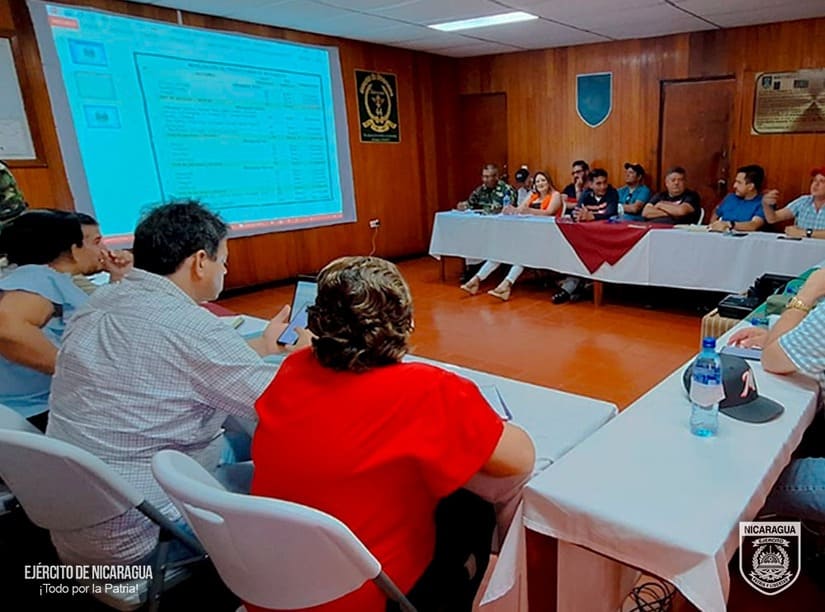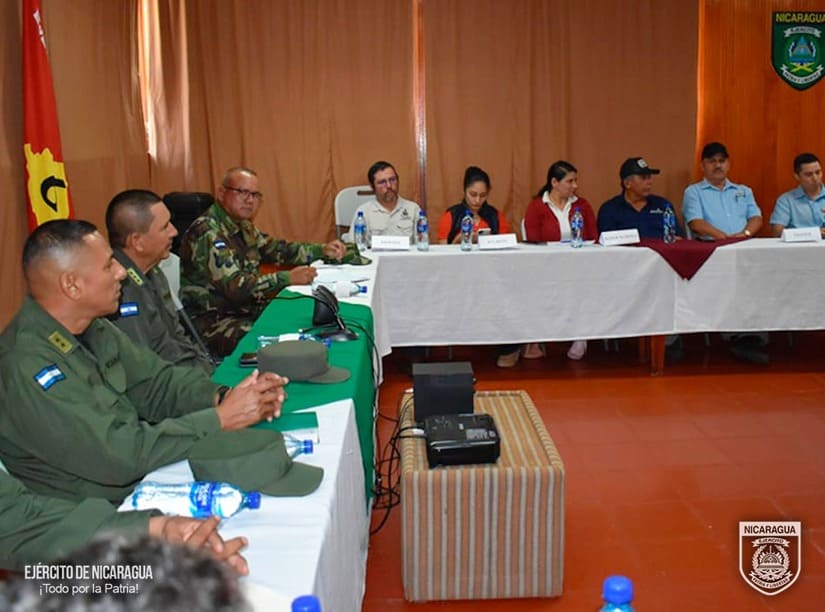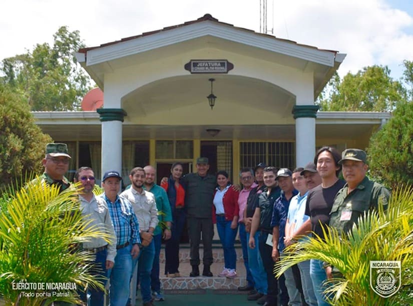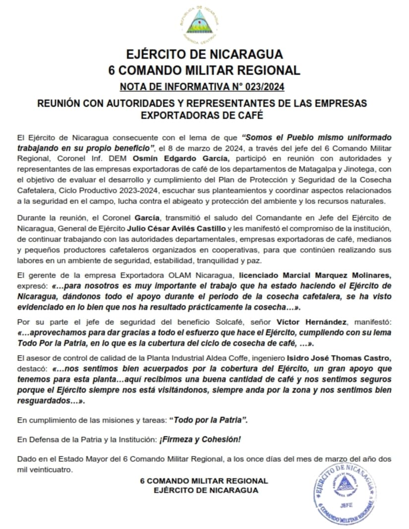 El Ejército de Nicaragua consecuente con el lema de que “Somos el Pueblo mismo uniformado trabajando en su propio beneficio”, el 8 de marzo de 2024, a través del jefe del 6 Comando Militar Regional, Coronel Inf. DEM Osmín Edgardo García, participó en reunión con autoridades y representantes de las empresas exportadoras de café de los departamentos de Matagalpa y Jinotega, con el objetivo de evaluar el desarrollo y cumplimiento del Plan de Protección y Seguridad de la Cosecha Cafetalera, Ciclo Productivo 2023-2024, escuchar sus planteamientos y coordinar aspectos relacionados a la seguridad en el campo, lucha contra el abigeato y protección del ambiente y los recursos naturales.