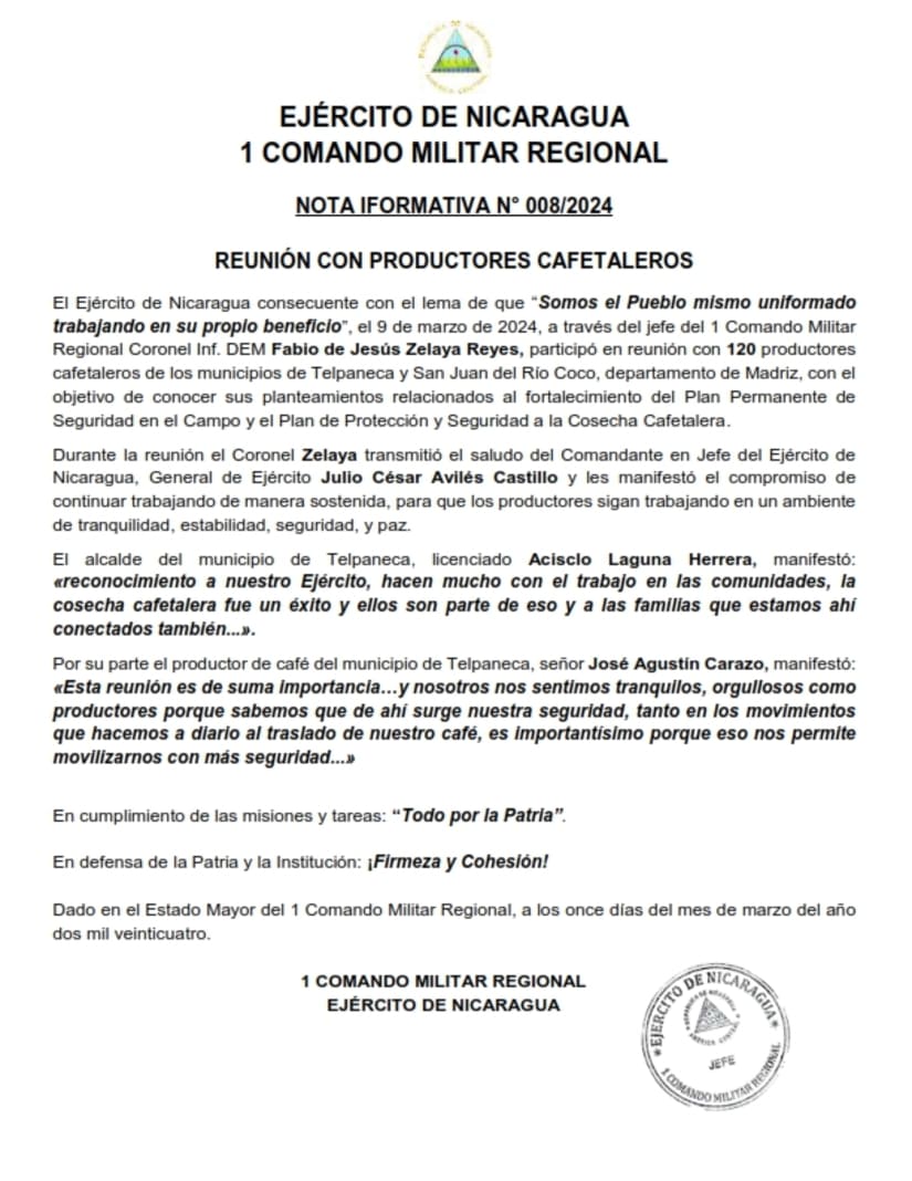 El Ejército de Nicaragua consecuente con el lema de que “Somos el Pueblo mismo uniformado trabajando en su propio beneficio”, el 9 de marzo de 2024, a través del jefe del 1 Comando Militar Regional Coronel Inf. DEM Fabio de Jesús Zelaya Reyes, participó en reunión con 120 productores cafetaleros de los municipios de Telpaneca y San Juan del Río Coco, departamento de Madriz, con el objetivo de conocer sus planteamientos relacionados al fortalecimiento del Plan Permanente de Seguridad en el Campo y el Plan de Protección y Seguridad a la Cosecha Cafetalera.