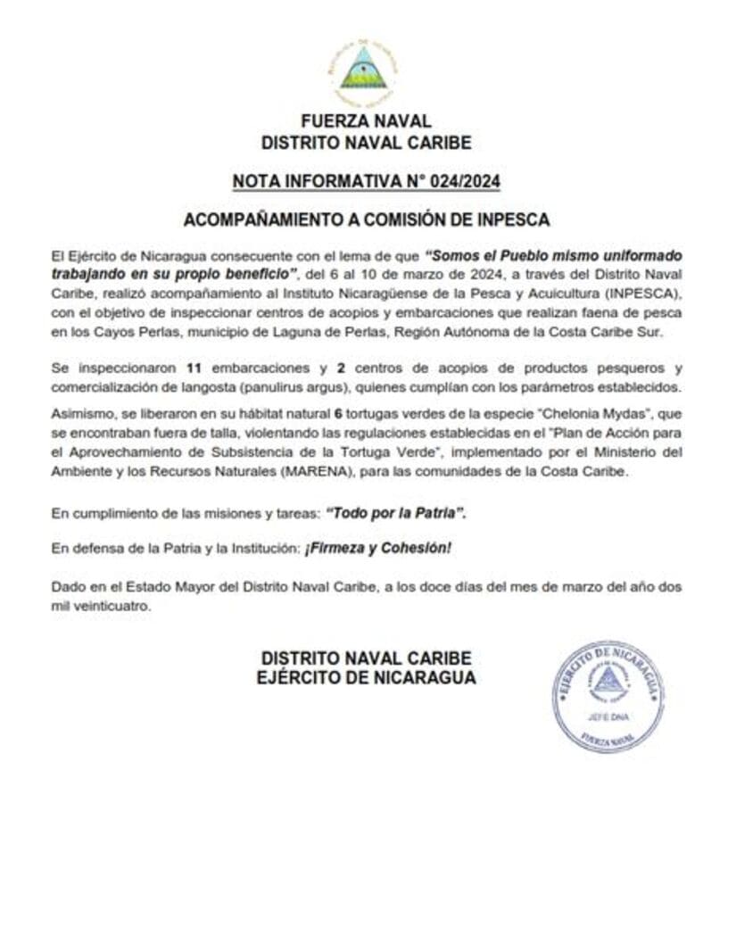 El Ejército de Nicaragua consecuente con el lema de que “Somos el Pueblo mismo uniformado trabajando en su propio beneficio”, del 6 al 10 de marzo de 2024, a través del Distrito Naval Caribe, realizó acompañamiento al Instituto Nicaragüense de la Pesca y Acuicultura (INPESCA), con el objetivo de inspeccionar centros de acopios y embarcaciones que realizan faena de pesca en los Cayos Perlas, municipio de Laguna de Perlas, Región Autónoma de la Costa Caribe Sur.