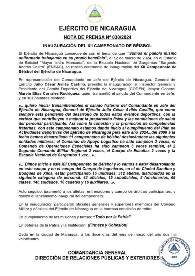 El Ejército de Nicaragua consecuente con el lema de que “Somos el pueblo mismo uniformado trabajando en su propio beneficio”, el 12 de marzo de 2024, en el Estadio de Béisbol “Mayor Isidro Moncada”, de la Escuela Nacional de Sargentos “Sargento Andrés Castro” (ENSAC), se realizó ceremonia de inauguración del XII Campeonato de Béisbol del Ejército de Nicaragua.