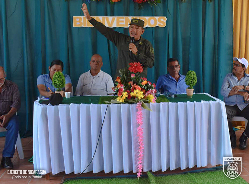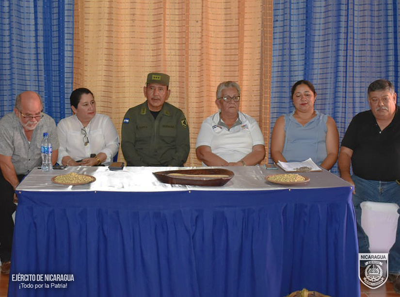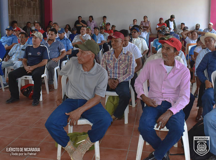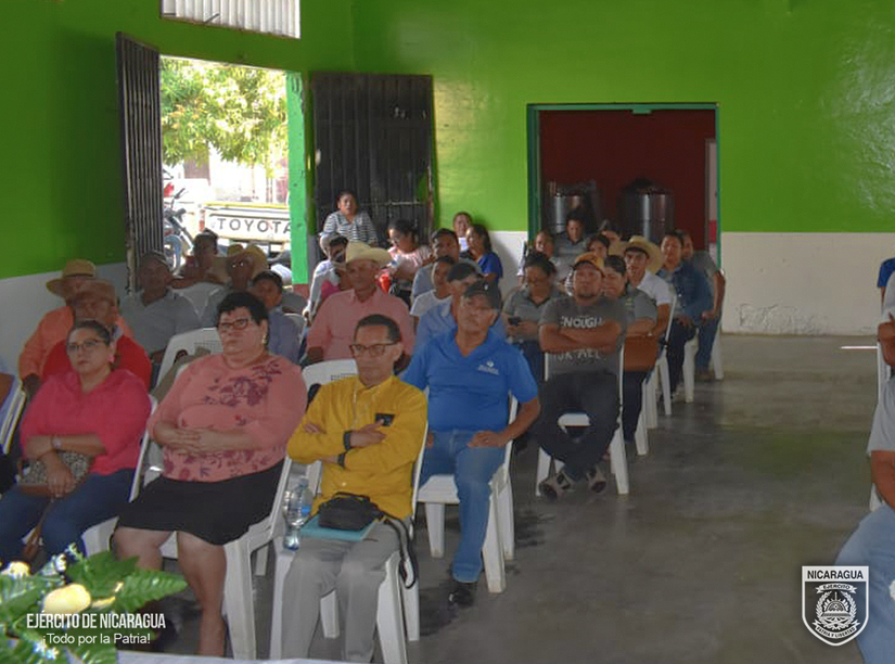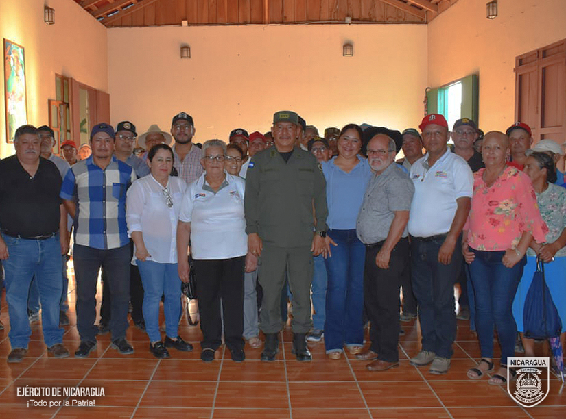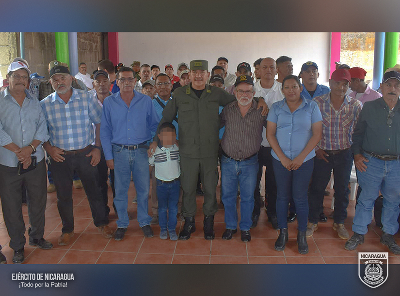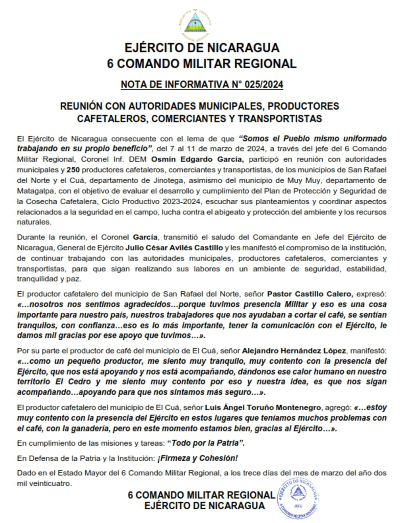 El Ejército de Nicaragua consecuente con el lema de que “Somos el Pueblo mismo uniformado trabajando en su propio beneficio”, del 7 al 11 de marzo de 2024, a través del jefe del 6 Comando Militar Regional, Coronel Inf. DEM Osmín Edgardo García, participó en reunión con autoridades municipales y 250 productores cafetaleros, comerciantes y transportistas, de los municipios de San Rafael del Norte y el Cuá, departamento de Jinotega, asimismo del municipio de Muy Muy, departamento de Matagalpa, con el objetivo de evaluar el desarrollo y cumplimiento del Plan de Protección y Seguridad de la Cosecha Cafetalera, Ciclo Productivo 2023-2024, escuchar sus planteamientos y coordinar aspectos relacionados a la seguridad en el campo, lucha contra el abigeato y protección del ambiente y los recursos naturales.